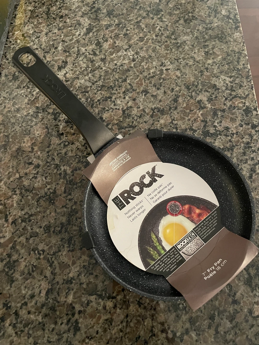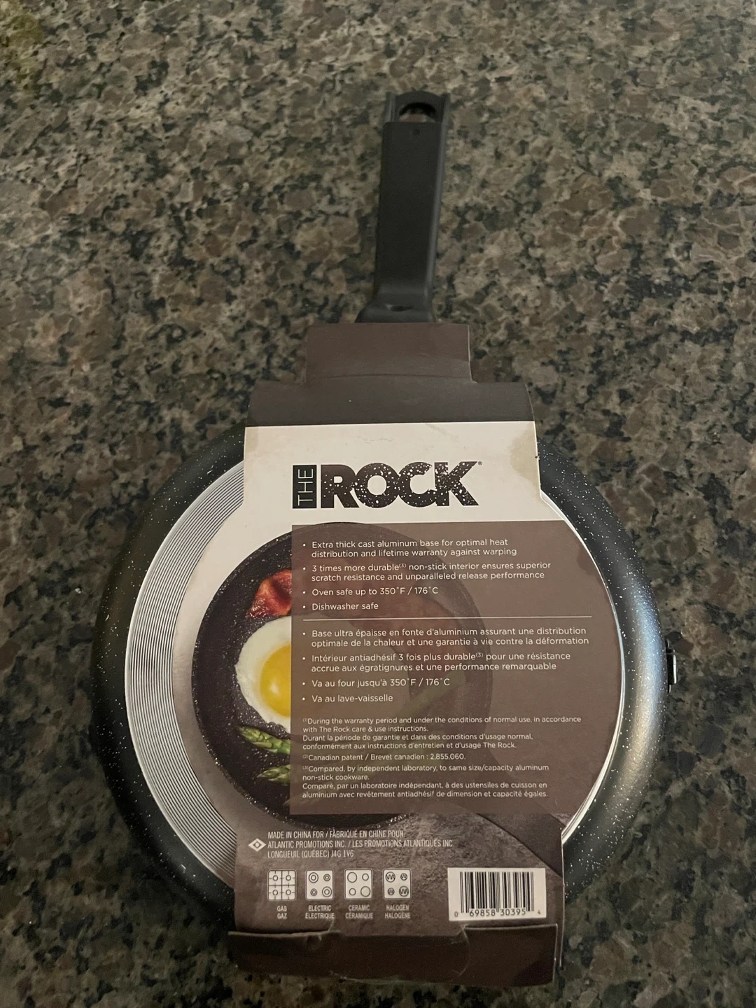Selling a brand new The Rock 7" fry pan! This pan is 18 cm and boasts a surface enhancement for a rock-like finish. It's designed so nothing sticks, never warps, and lasts longer. The extra thick cast aluminum base is optimal for heat distribution. It's also oven and dishwasher safe!