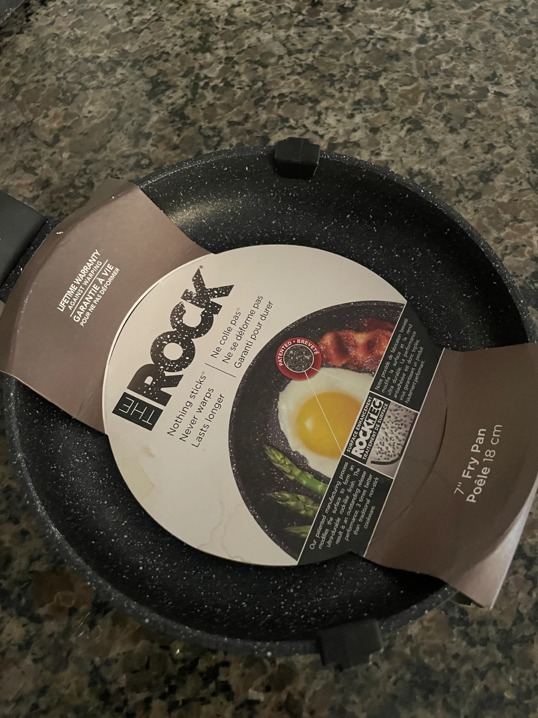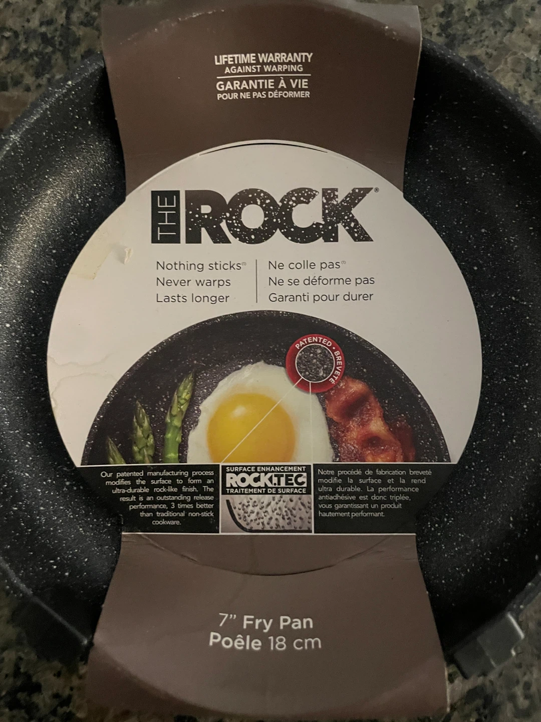 Selling a brand new The Rock 7" fry pan! This pan is 18 cm and boasts a surface enhancement for a rock-like finish. It's designed so nothing sticks, never warps, and lasts longer. The extra thick cast aluminum base is optimal for heat distribution. It's also oven and dishwasher safe!