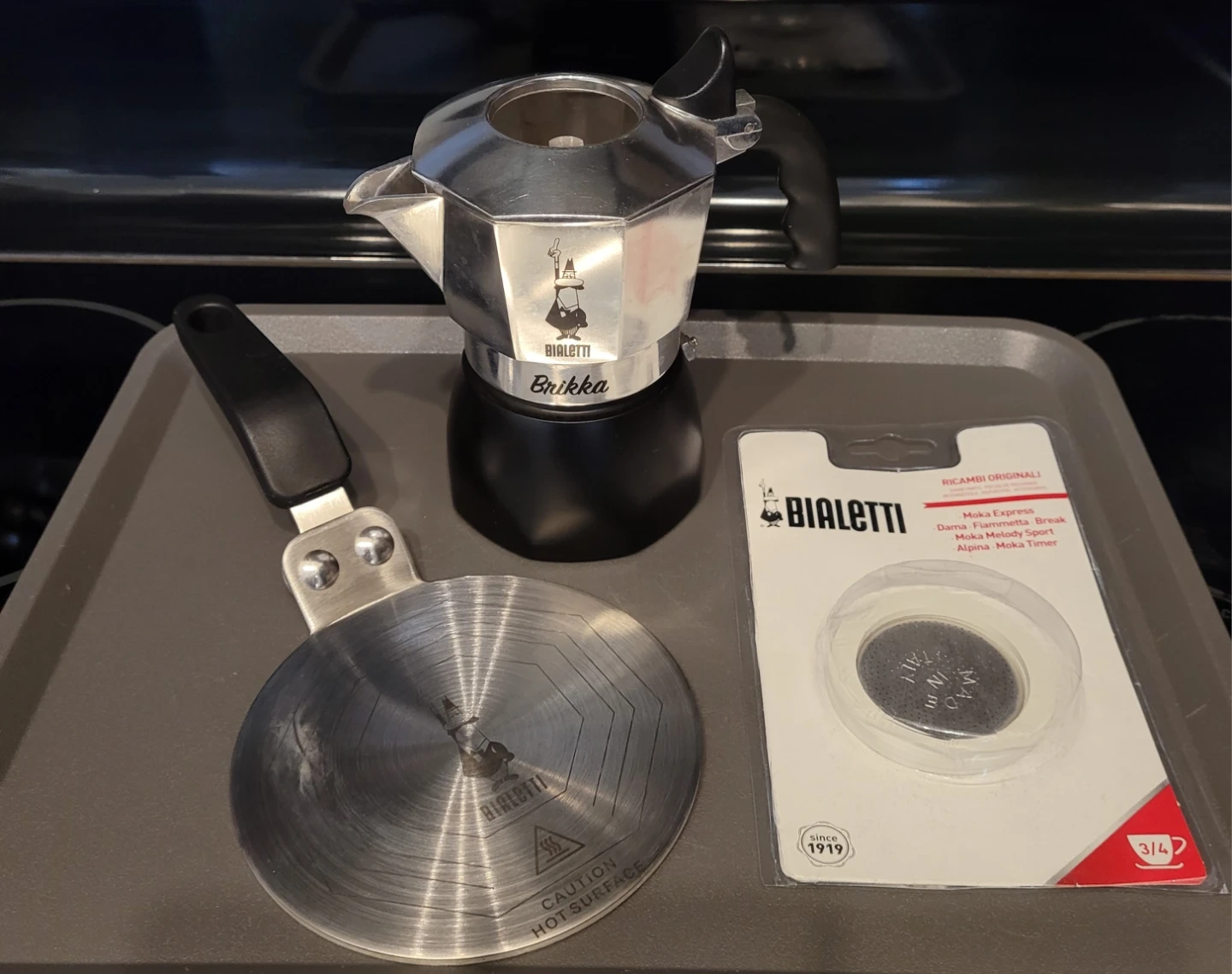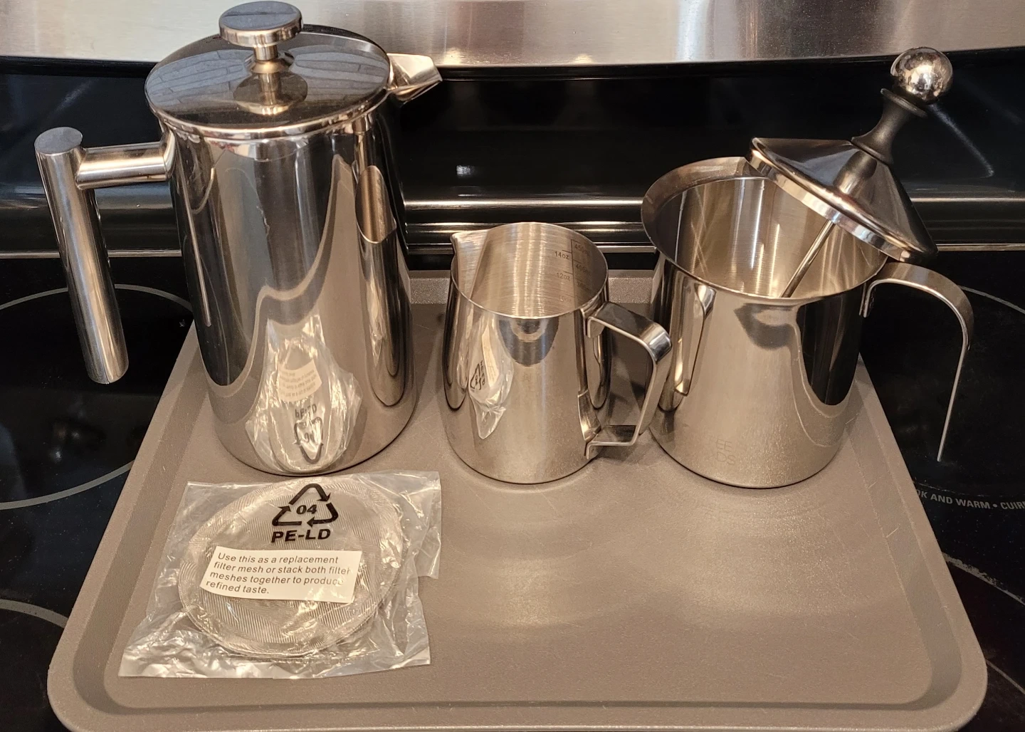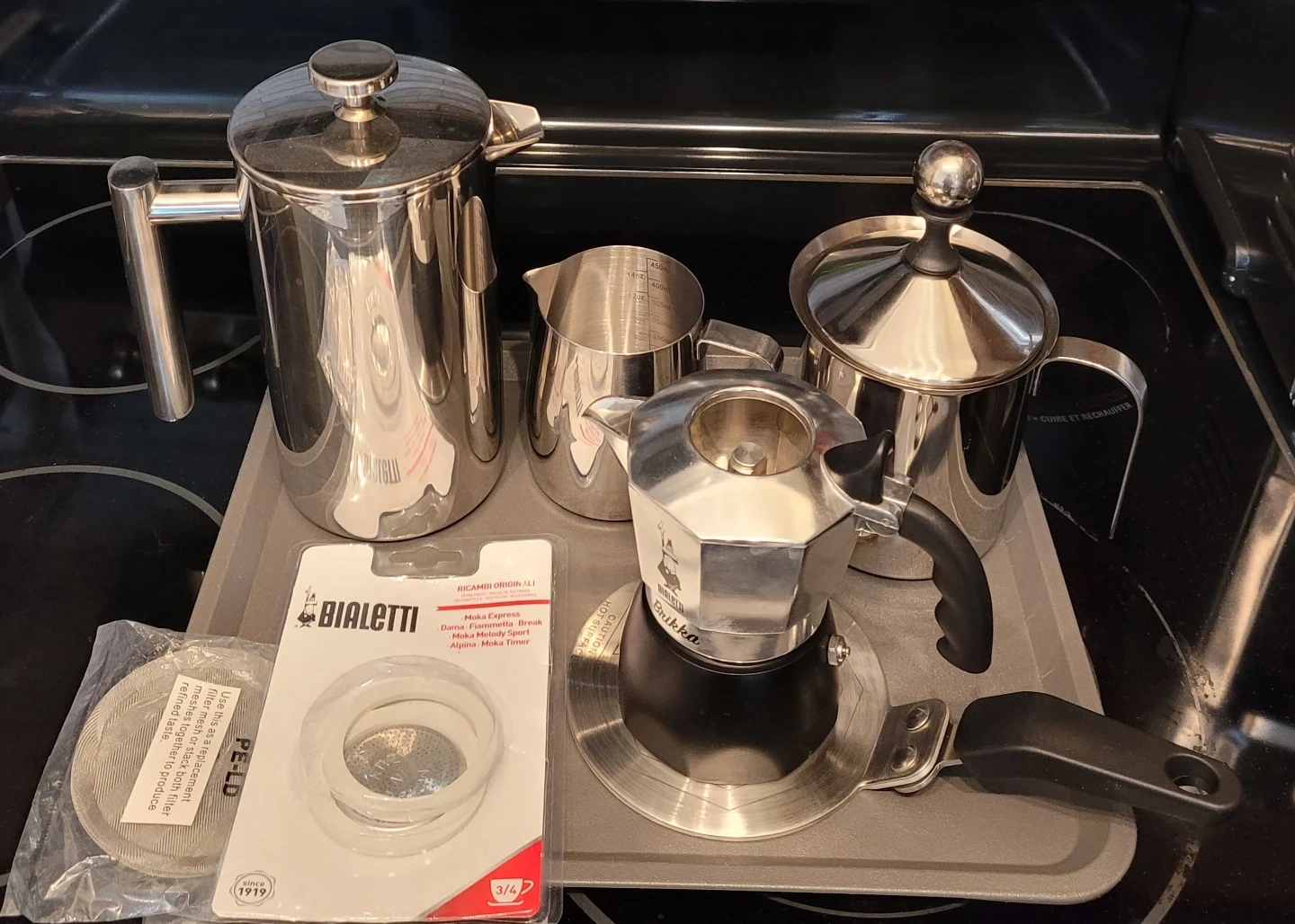 This set includes a Bialetti Moka Express espresso maker and a coffee grinder. Also included are a French press, a milk frother, a milk steaming pitcher, and a replacement filter pack. Stainless steel construction on most items.