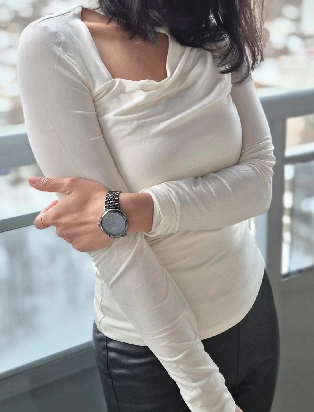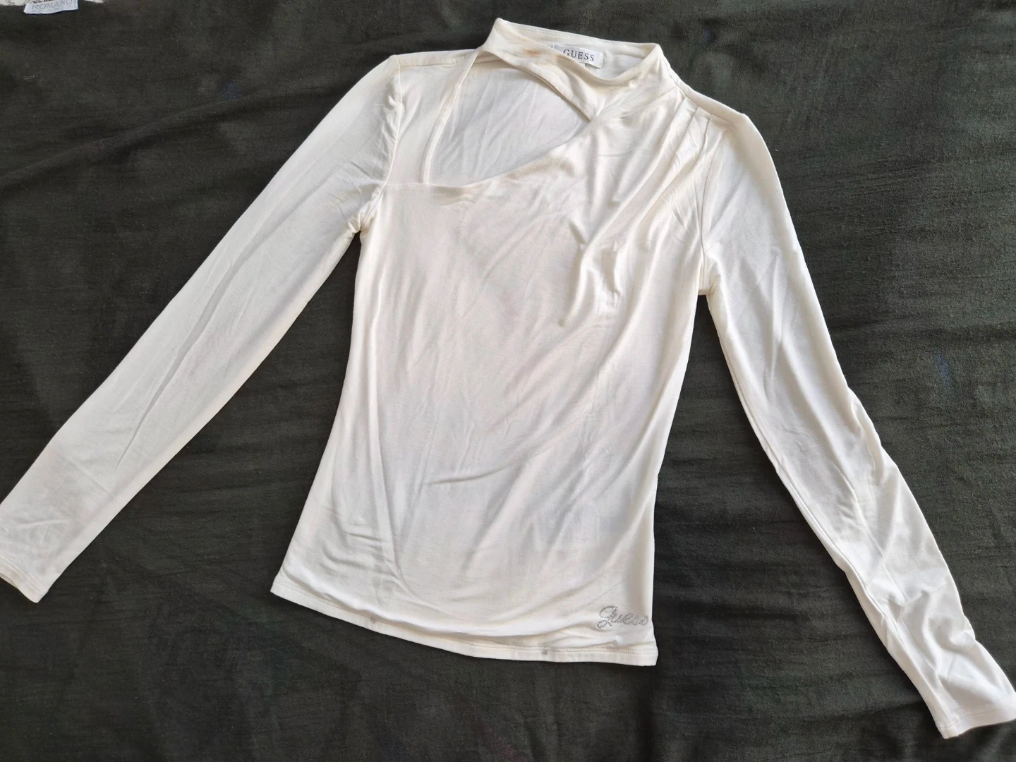 This cream Guess long-sleeve top features a stylish mock neck with a cutout detail. It's made from a soft, stretchy material for a comfortable fit. Perfect for layering or wearing on its own!