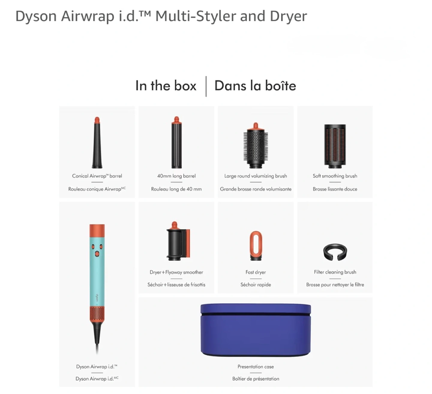 This is the Dyson Airwrap i.d. Multi-Styler and Dryer. It comes with multiple attachments including various barrels, brushes, a dryer, and a filter cleaning brush. It also includes a presentation case for storage.