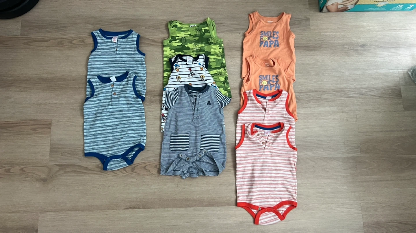 A collection of 9 sleeveless baby bodysuits and rompers. Includes striped, camouflage, and character prints, with some featuring 'Smiles for Papa' text. Materials are primarily cotton blends.