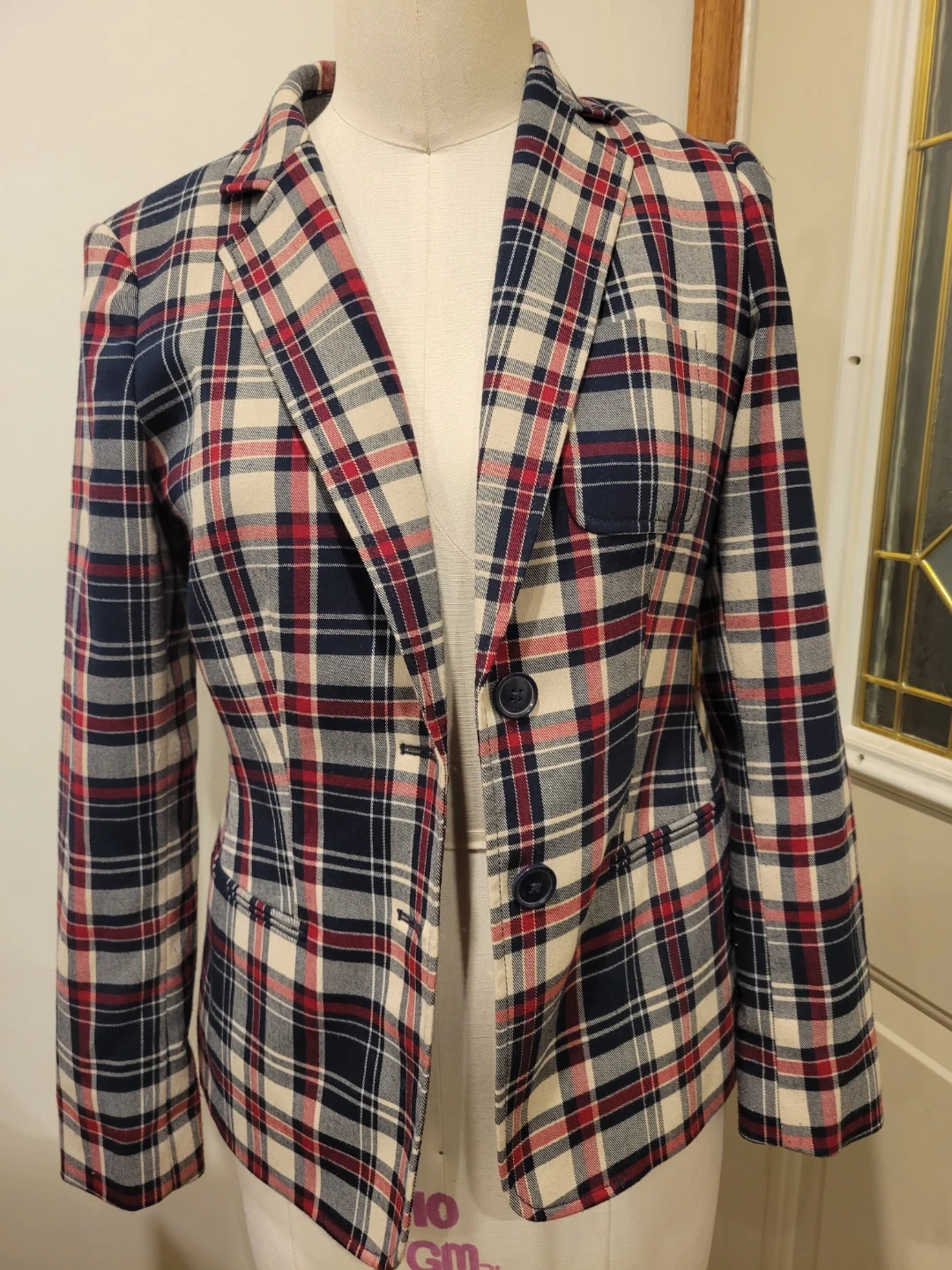 A classic Tommy Hilfiger blazer with a red, white, and blue plaid pattern. It features button closure and elbow patches. Made in Vietnam. From a smoke free home meetup location eglinton and dufferin area, Price is Firm!!