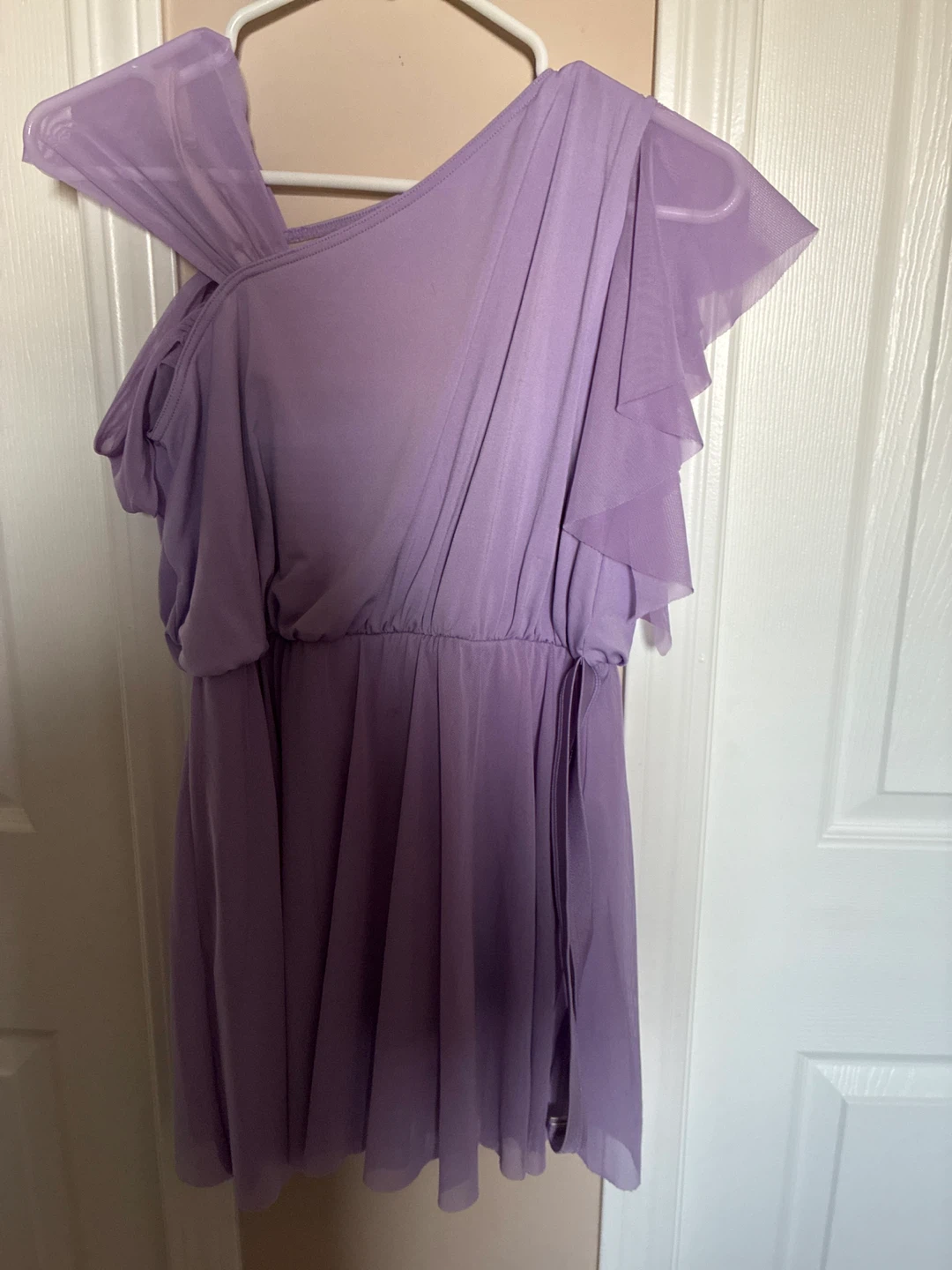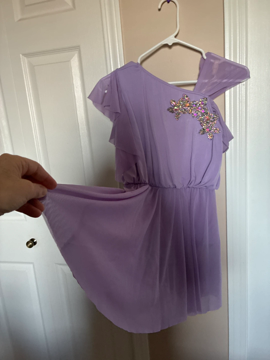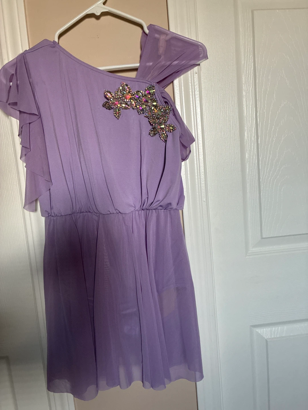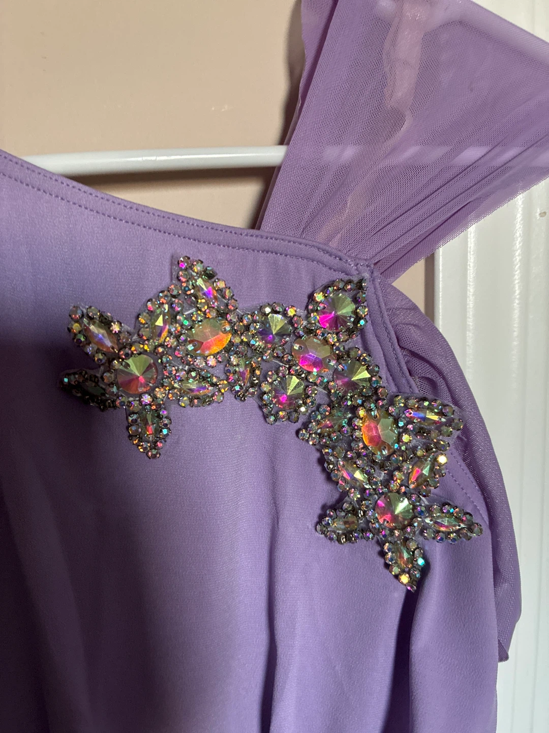 This lavender dance dress features a unique one-shoulder design with ruffled sleeves. It's embellished with sparkling rhinestones on the chest. The skirt is flowing and lightweight, perfect for movement. Includes a pair of nude tights.