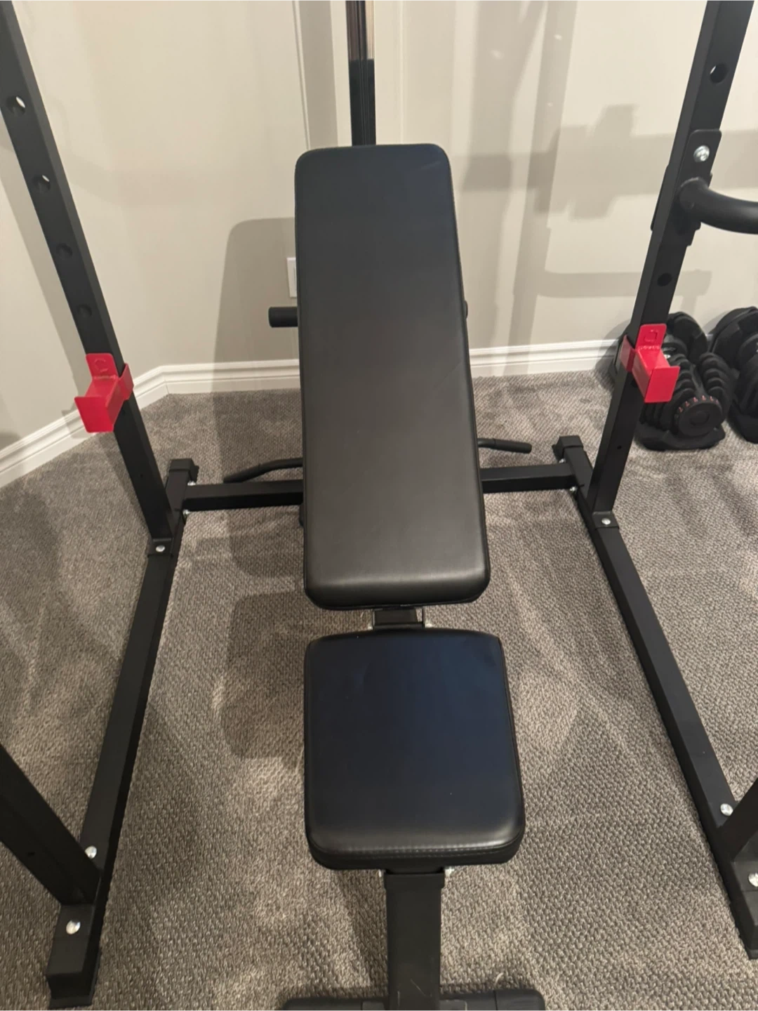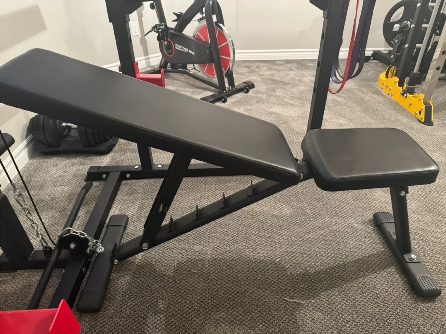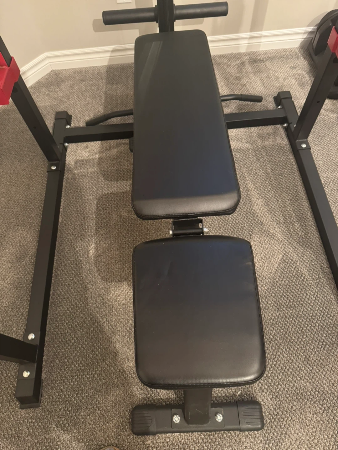 This is an adjustable weight bench for home workouts. It features padded upholstery for comfort and a sturdy metal frame. The bench can be adjusted to different incline levels for a variety of exercises. Great for strength training routines!
