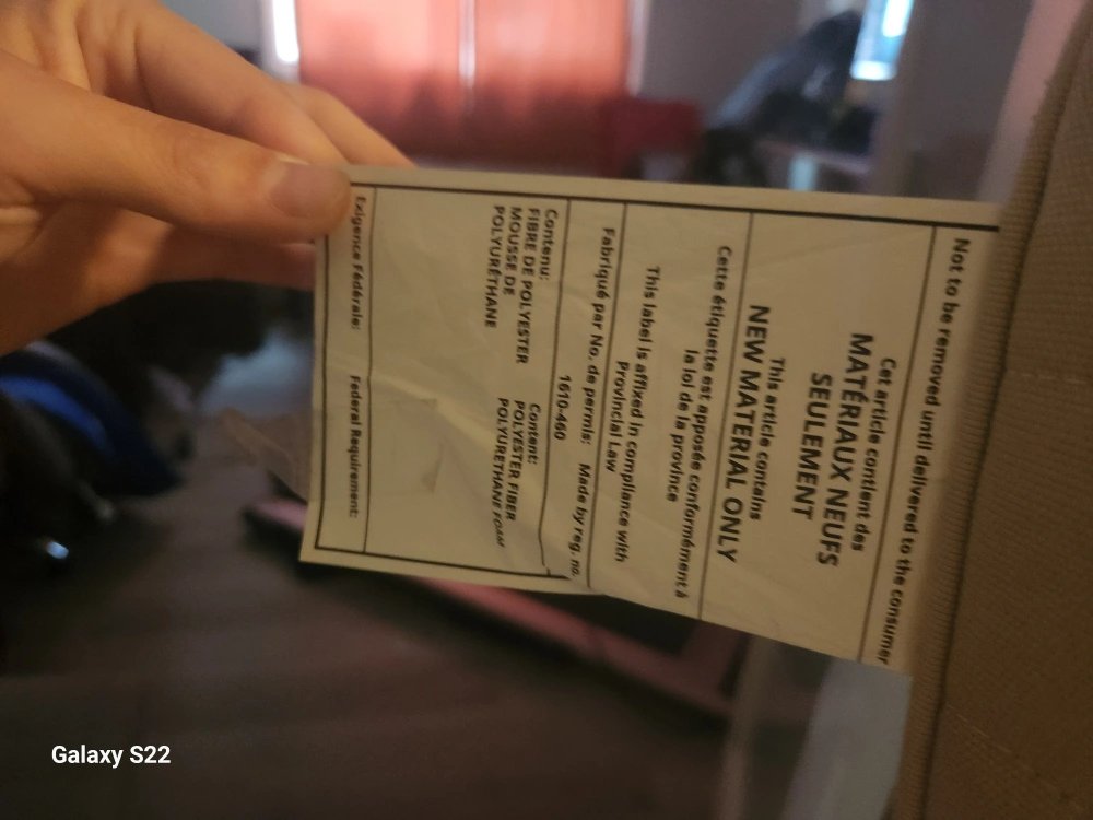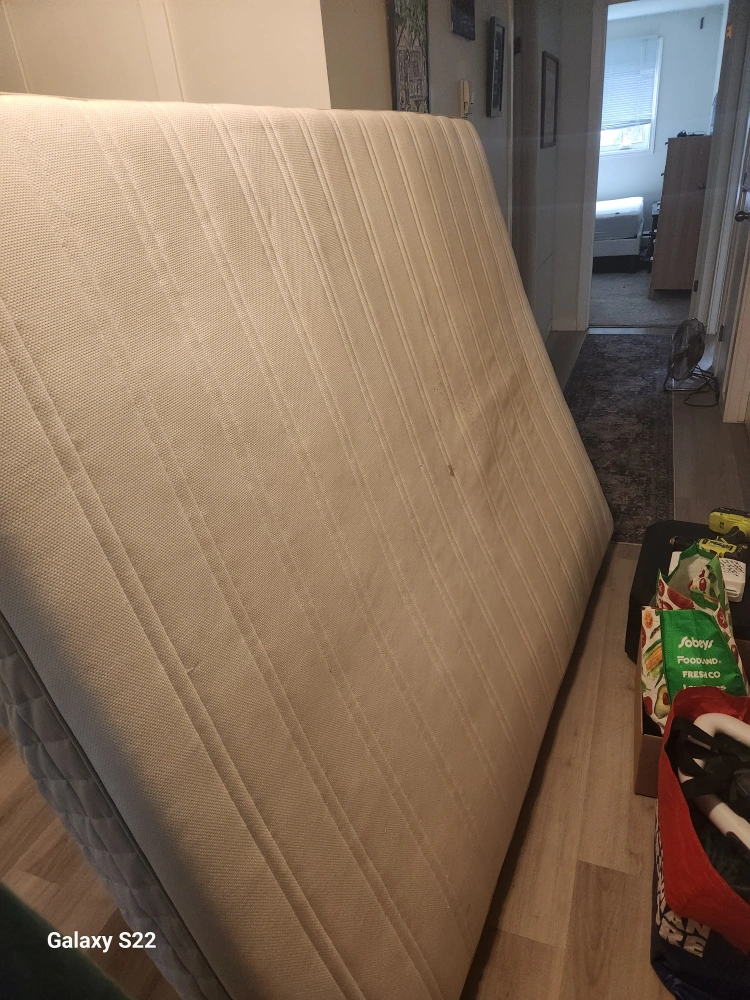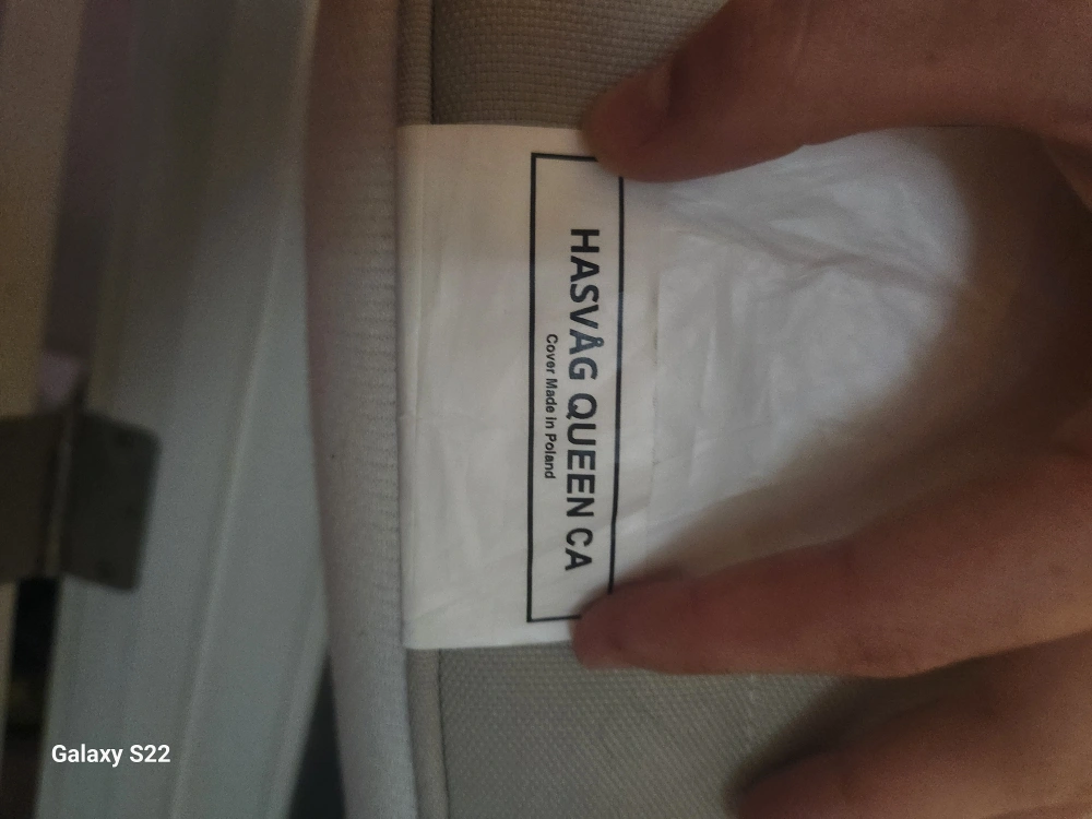 Selling an IKEA HÄSVÅG queen size mattress. It's in like new condition! The cover is made in Poland. The mattress contains polyester fiber and polyurethane foam. This label confirms it is a new material only.