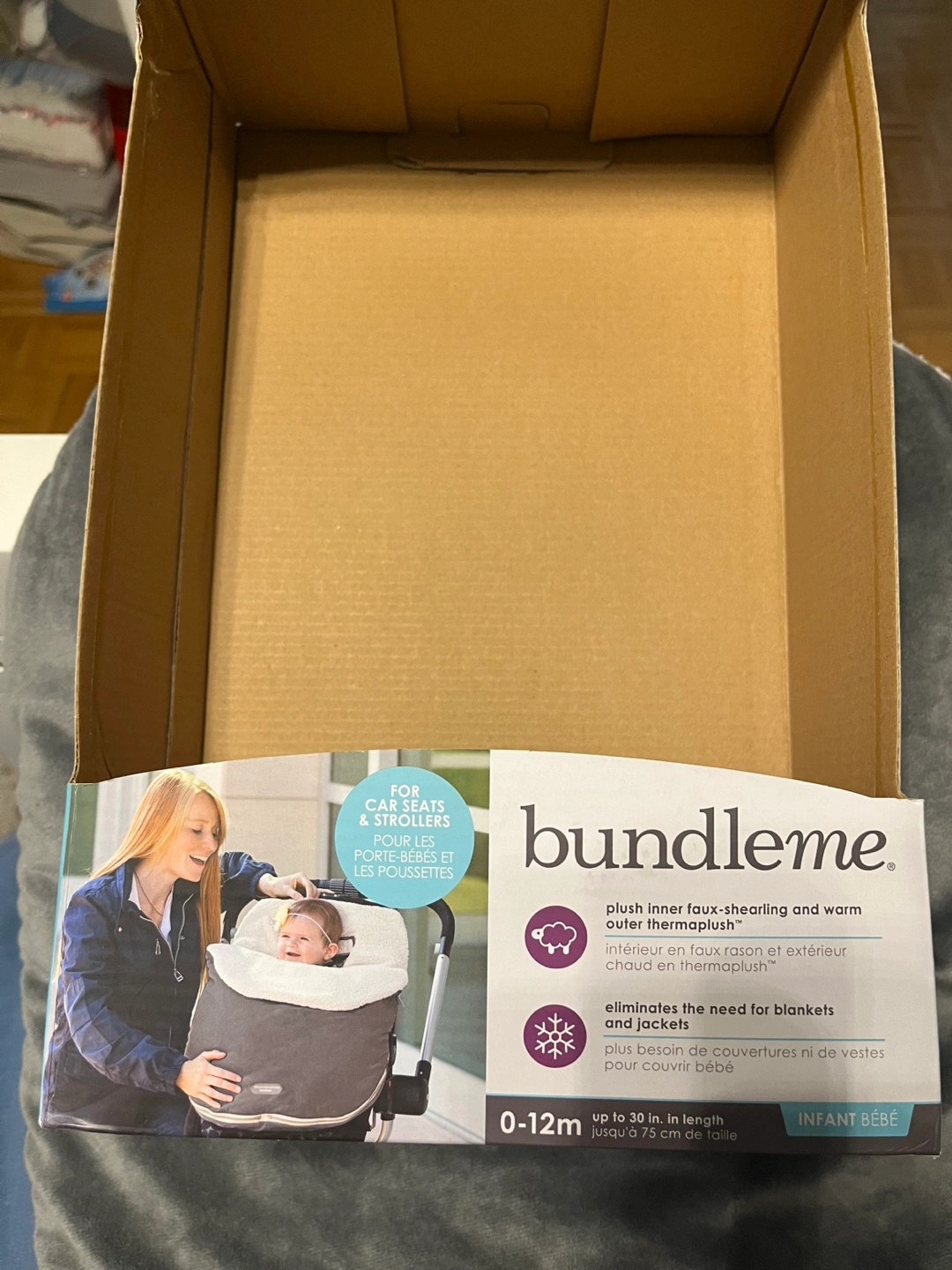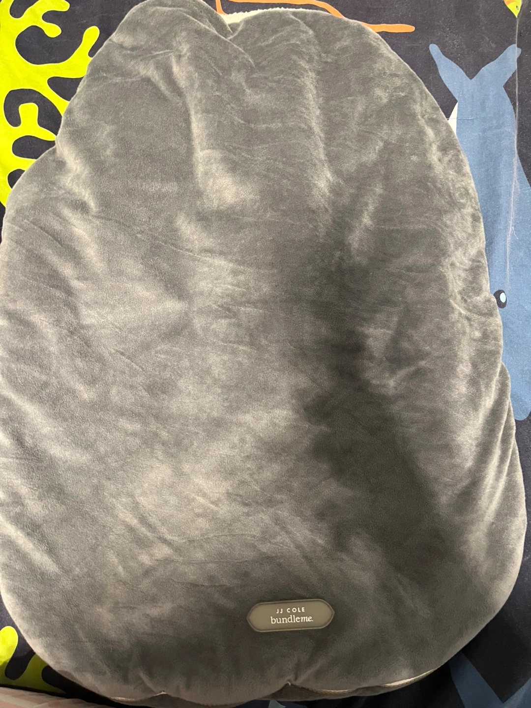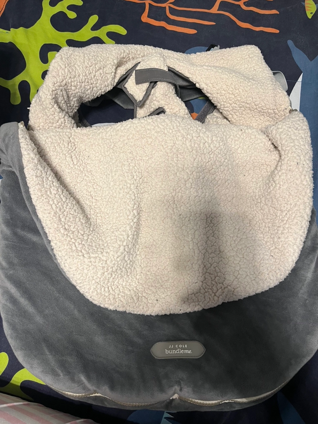 Grey and cream infant car seat cover. Plush faux-shearling interior. Warm and cozy. Eliminates the need for blankets. Suitable for 0-12 months.