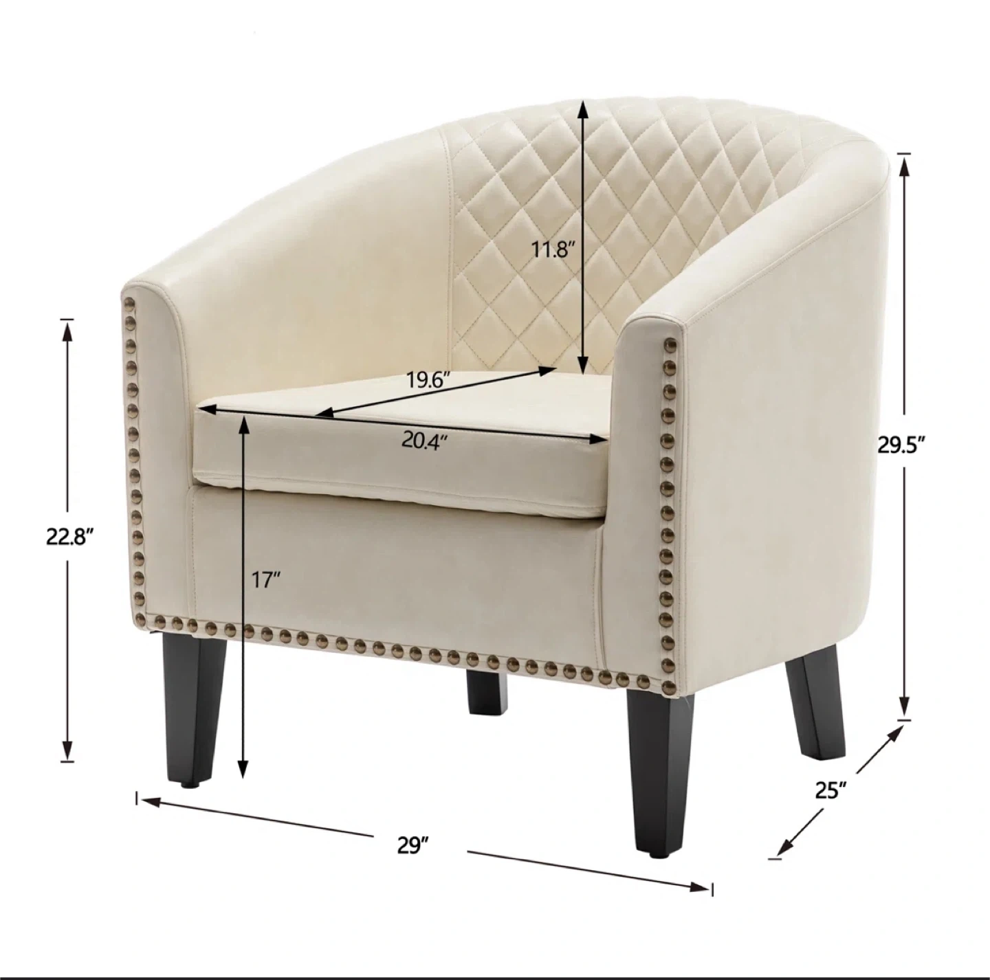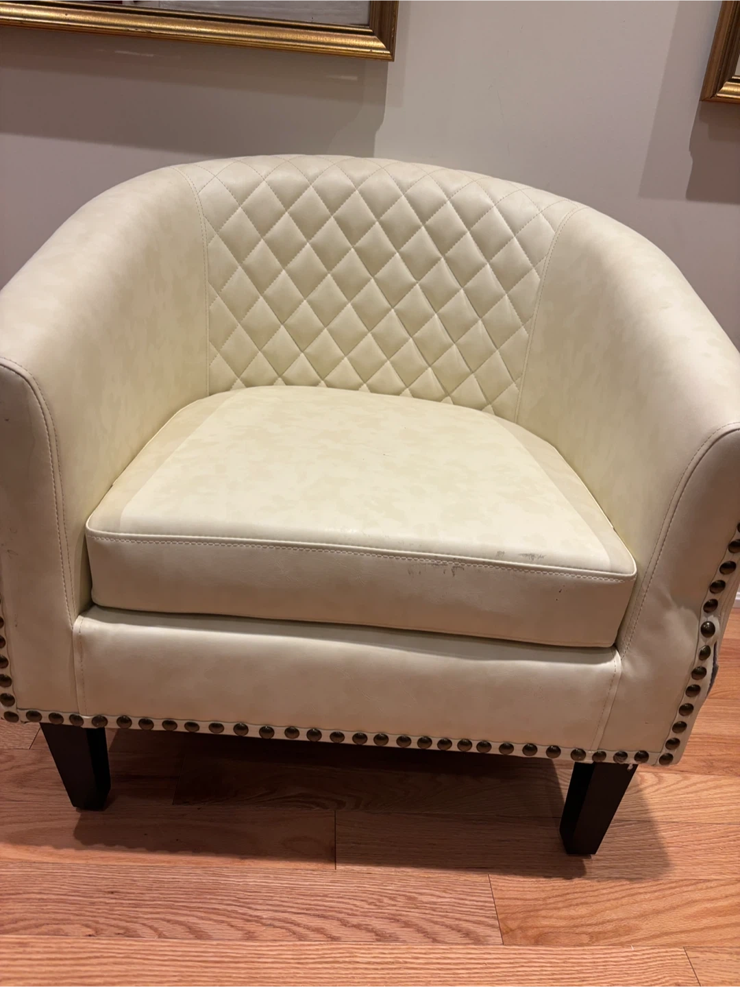Selling a cream-coloured barrel chair. It features a quilted back and nailhead trim, adding a touch of elegance to any room. There's a small tear on the side, as shown in the photos.item was purchased AS IS from Auction. Available for pickup and delivery