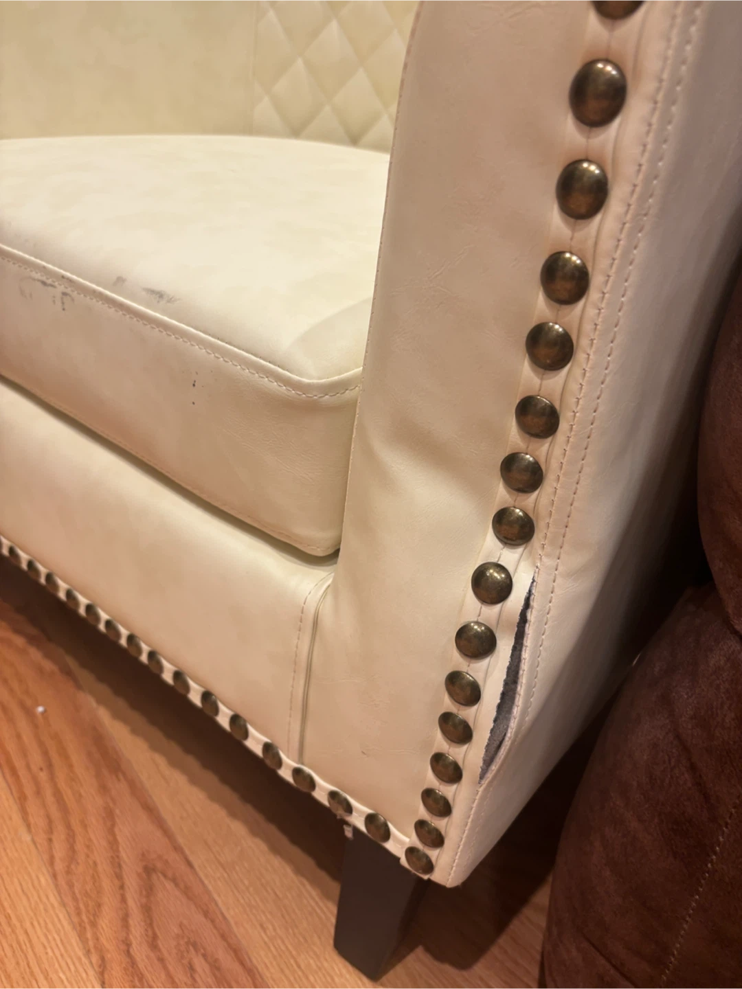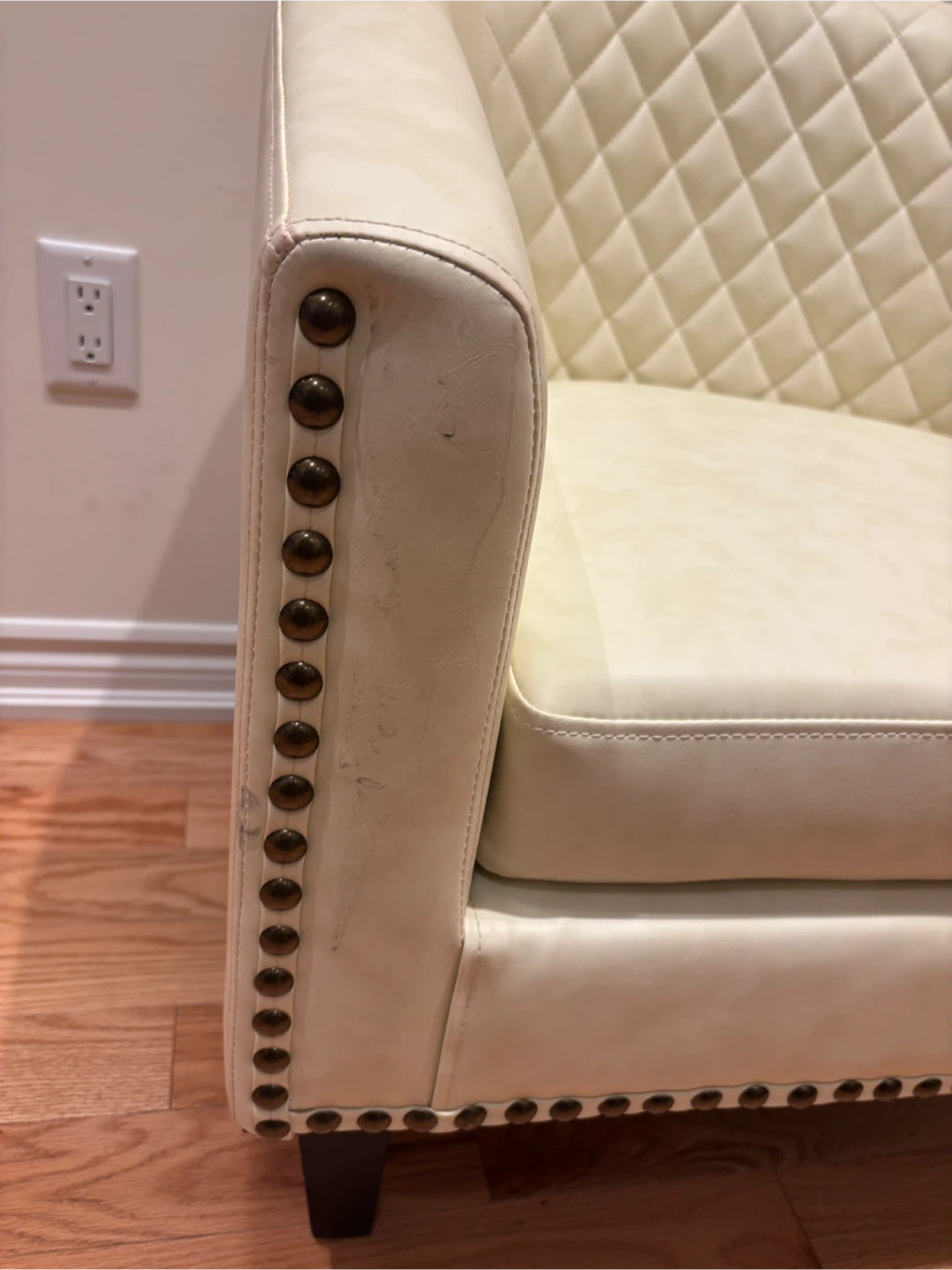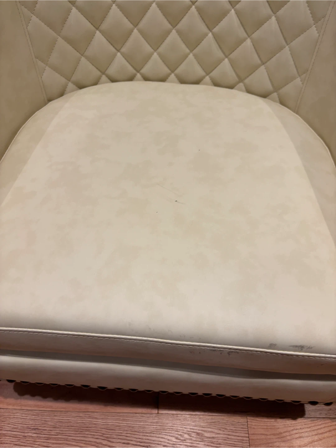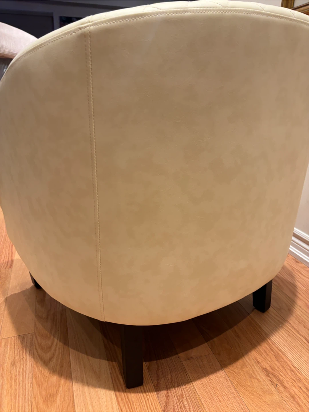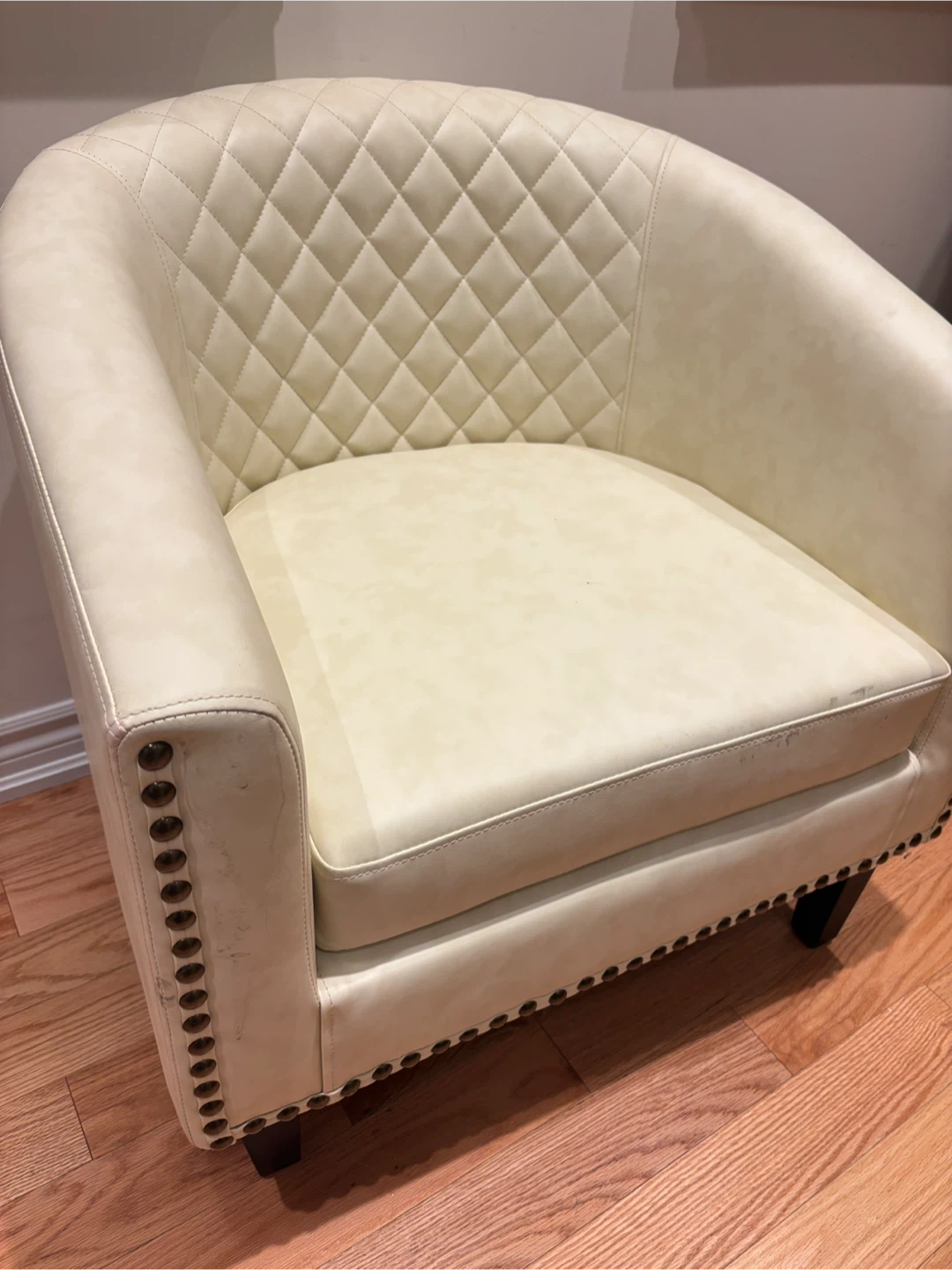 Selling a cream-coloured barrel chair. It features a quilted back and nailhead trim, adding a touch of elegance to any room. There's a small tear on the side, as shown in the photos.item was purchased AS IS from Auction. Available for pickup and delivery