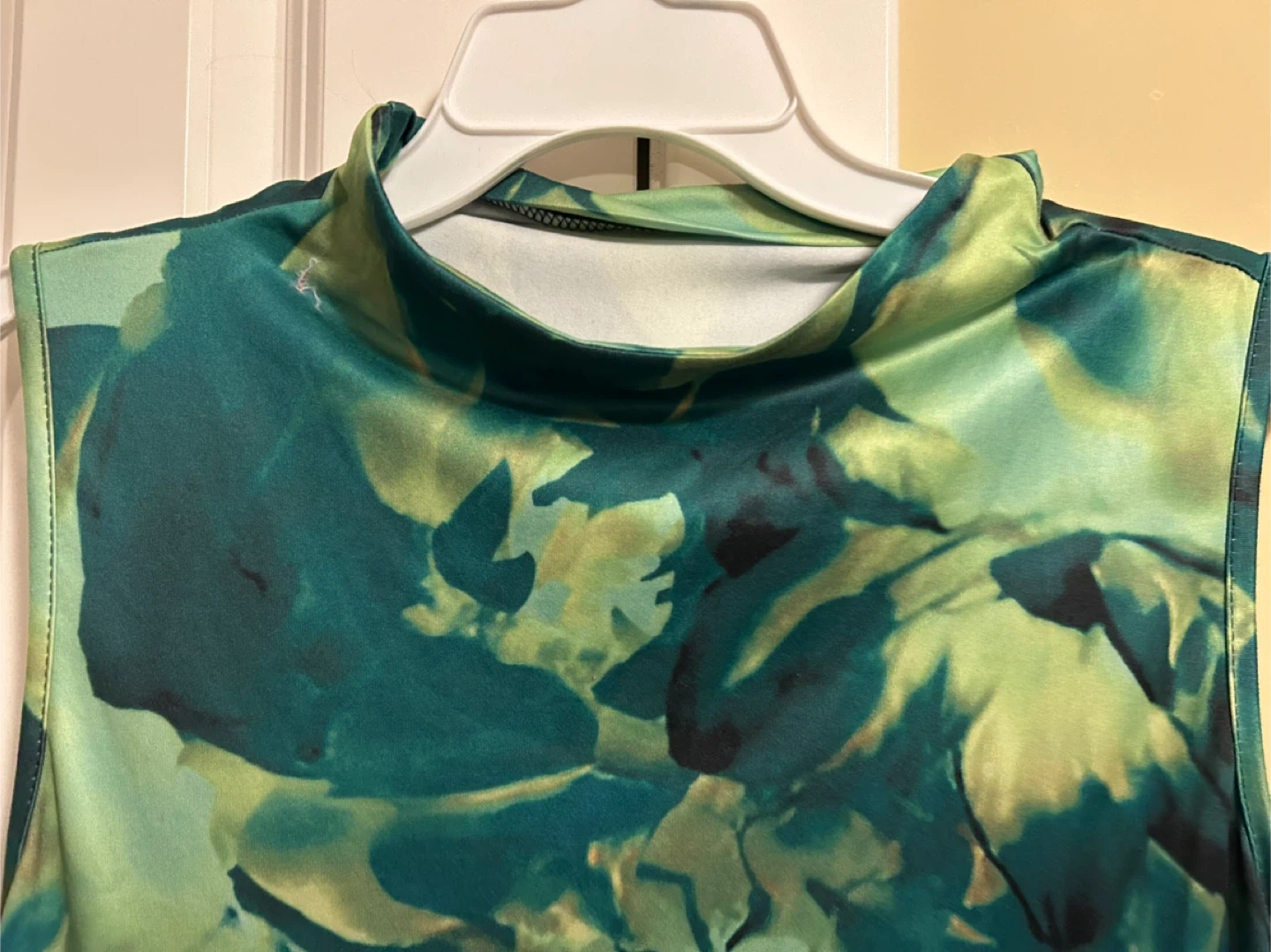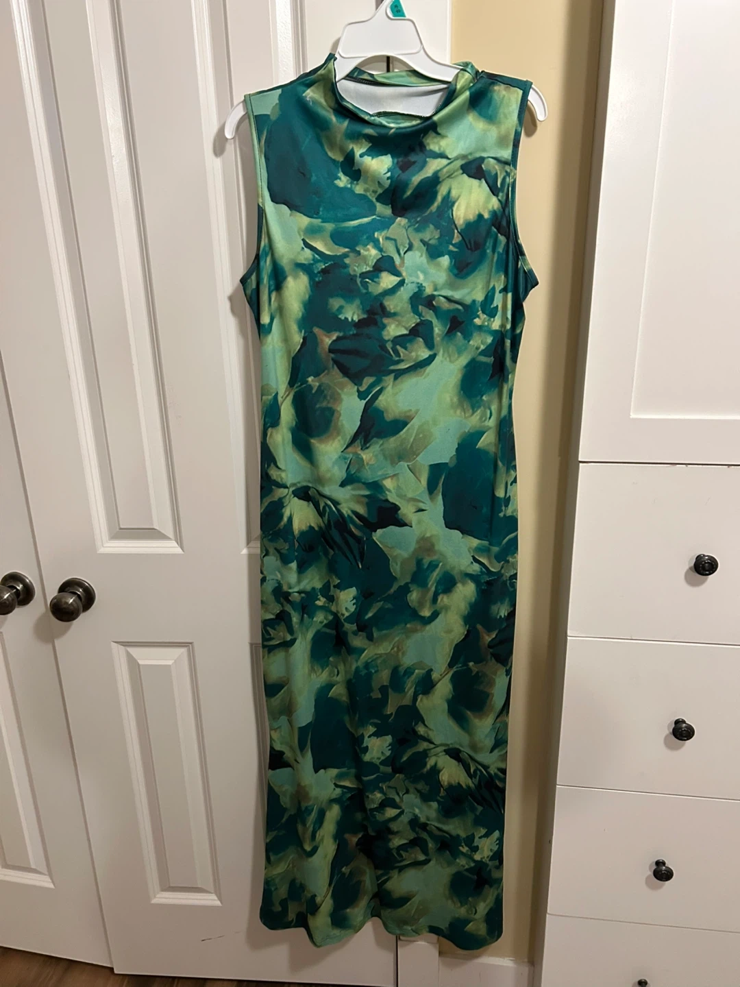 This sleeveless maxi dress features a vibrant green and abstract floral print. It has a mock neckline and a comfortable, stretchy fit. It's a stylish choice for a variety of occasions!