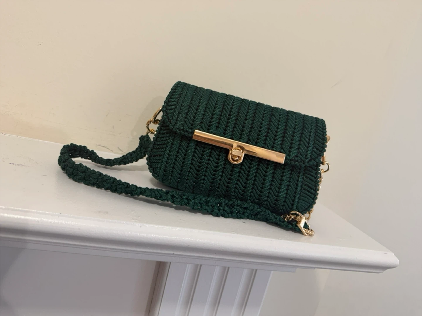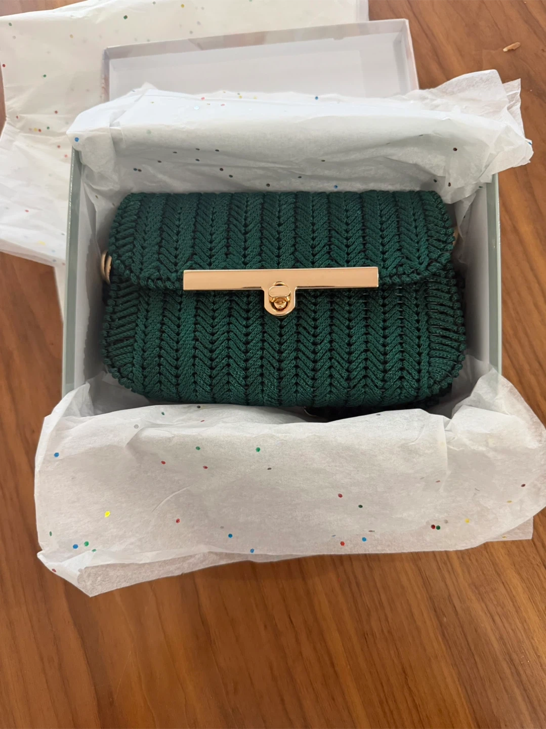 This is a dark green woven shoulder bag with a gold turn-lock closure. It comes with a braided strap and a gold chain strap. The bag is neatly presented in its original box with tissue paper.