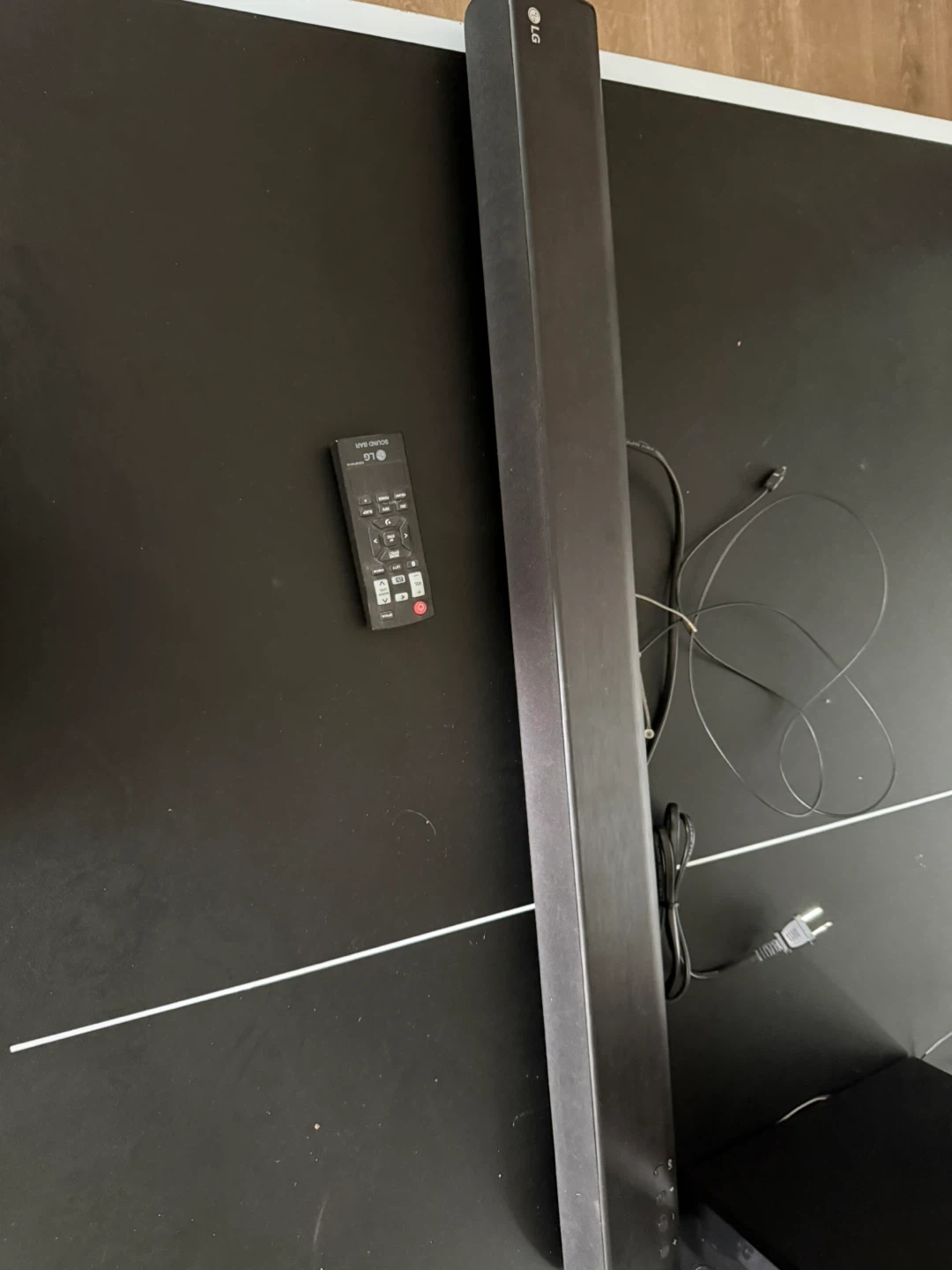 This LG sound bar system comes complete with a subwoofer and remote control. It's designed to enhance your home audio experience. The bar has a sleek black finish.
