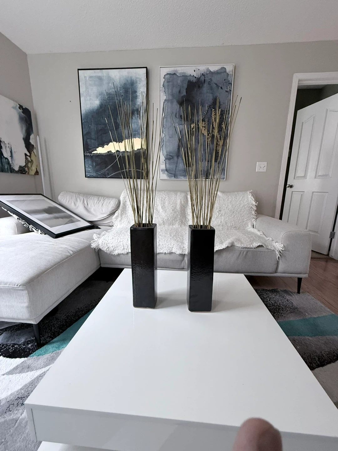 Pair of Black Square Vases with Decorative Reeds