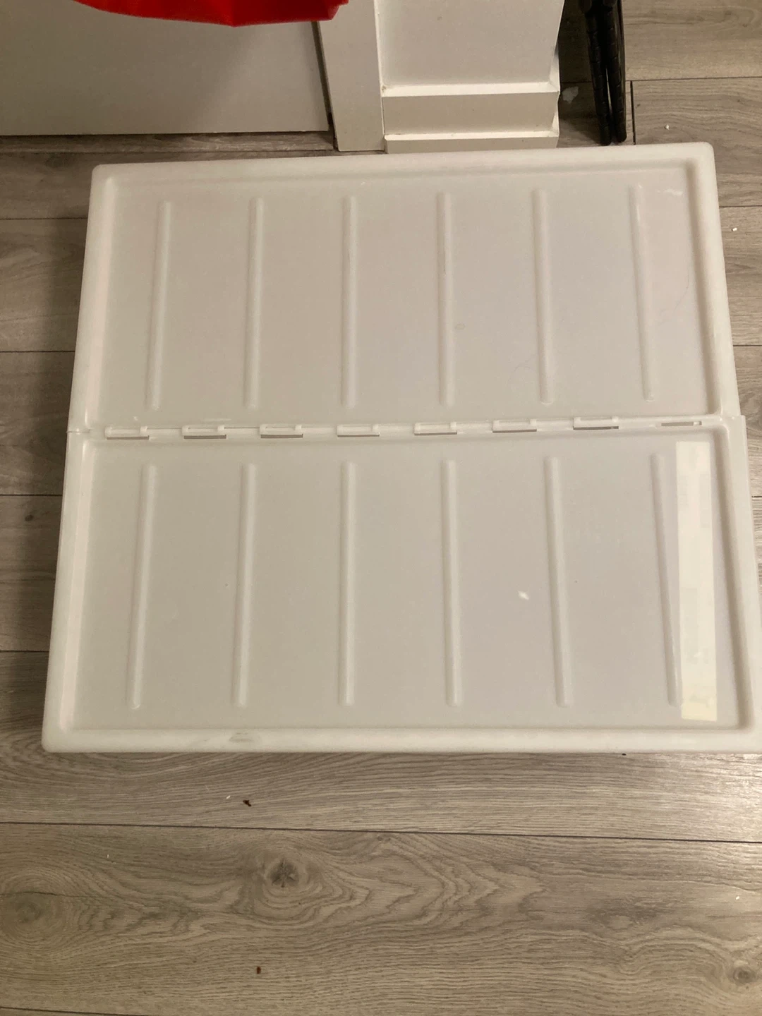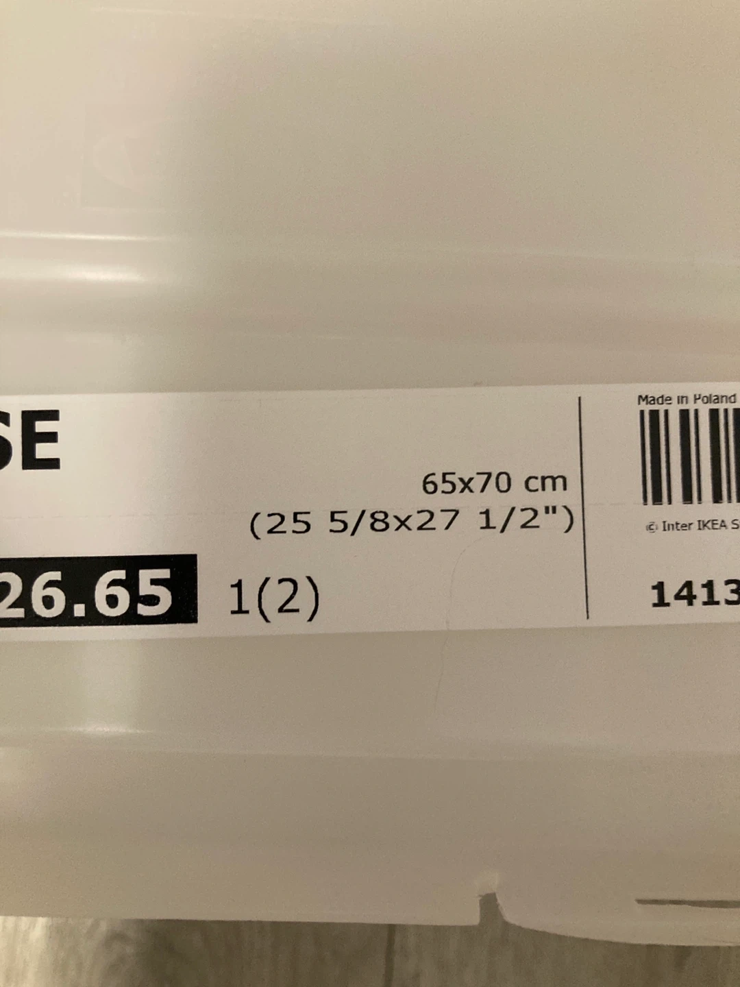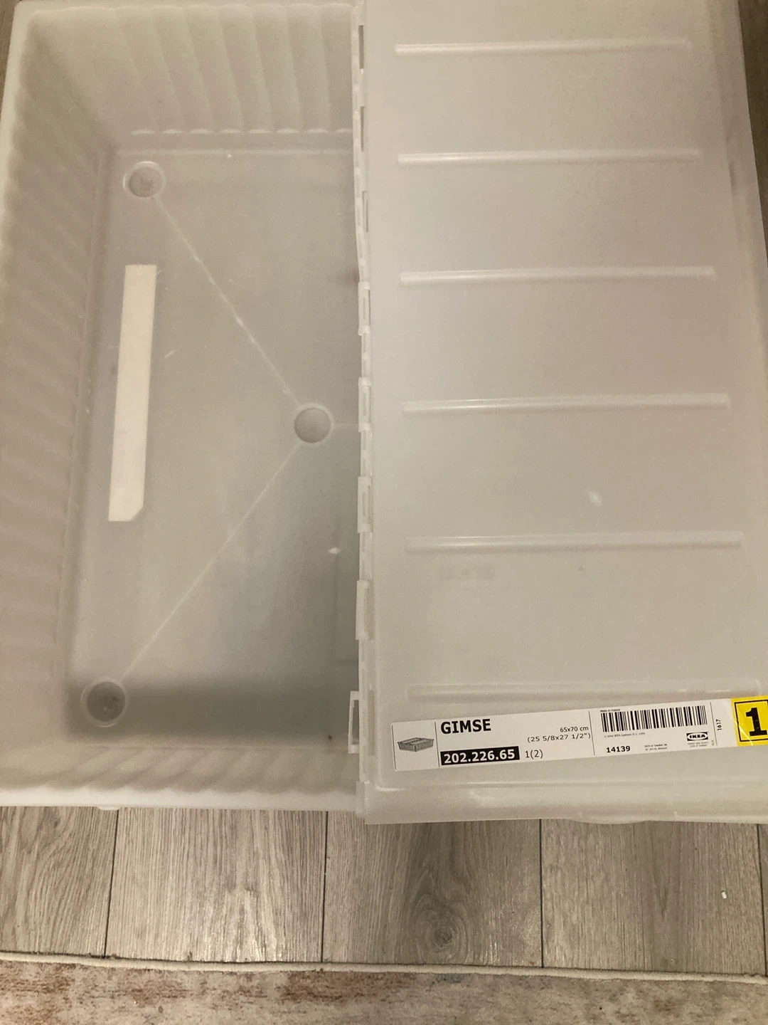 This is an IKEA GIMSE storage box with its lid. It measures 65 by 70 cm (25 5/8" by 27 1/2"). This box is great for organizing larger items in your home. It's made of plastic.