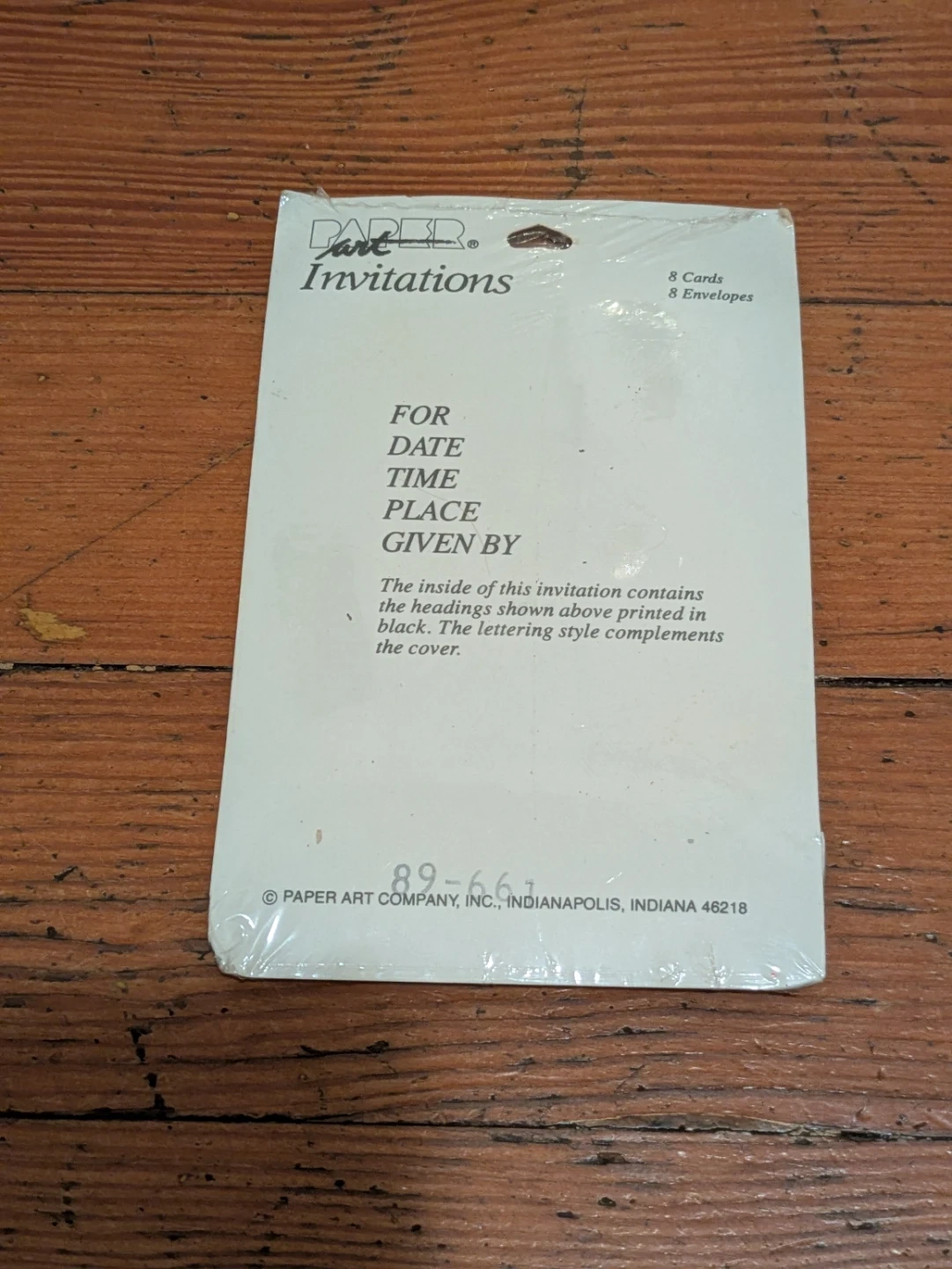 I'm selling two packs of Vintage Paper Art Invitations, which includes 8 cards and 8 envelopes. The invitations are perfect for any occasion where you need to fill in the date, time, place, and who it's given by. The inside of the invitation contains headings printed in black, and the lettering style complements the cover.