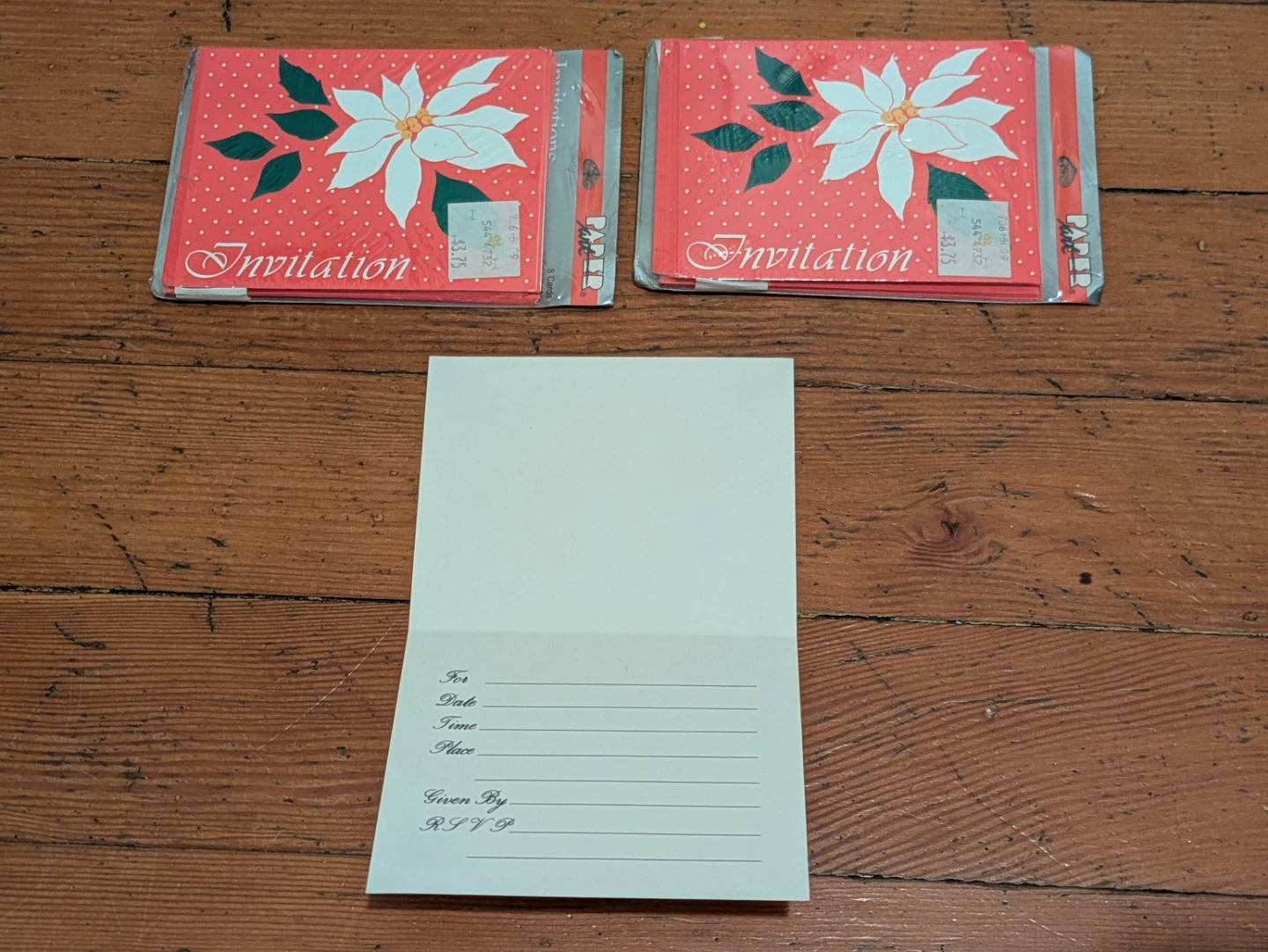 I'm selling two packs of Vintage Paper Art Invitations, which includes 8 cards and 8 envelopes. The invitations are perfect for any occasion where you need to fill in the date, time, place, and who it's given by. The inside of the invitation contains headings printed in black, and the lettering style complements the cover.