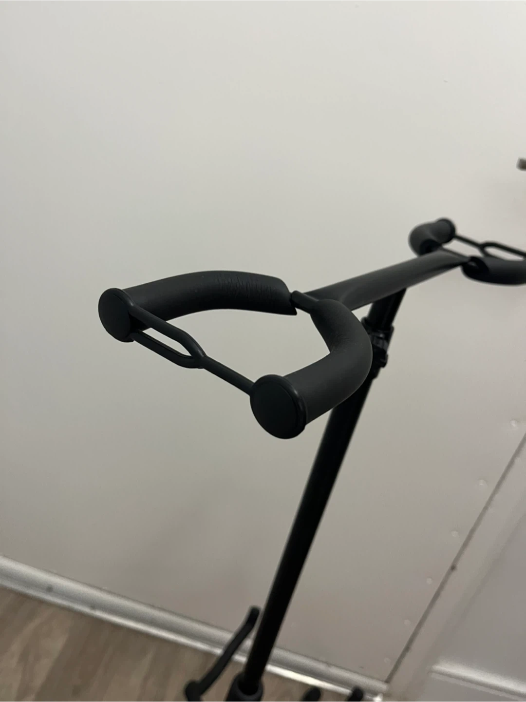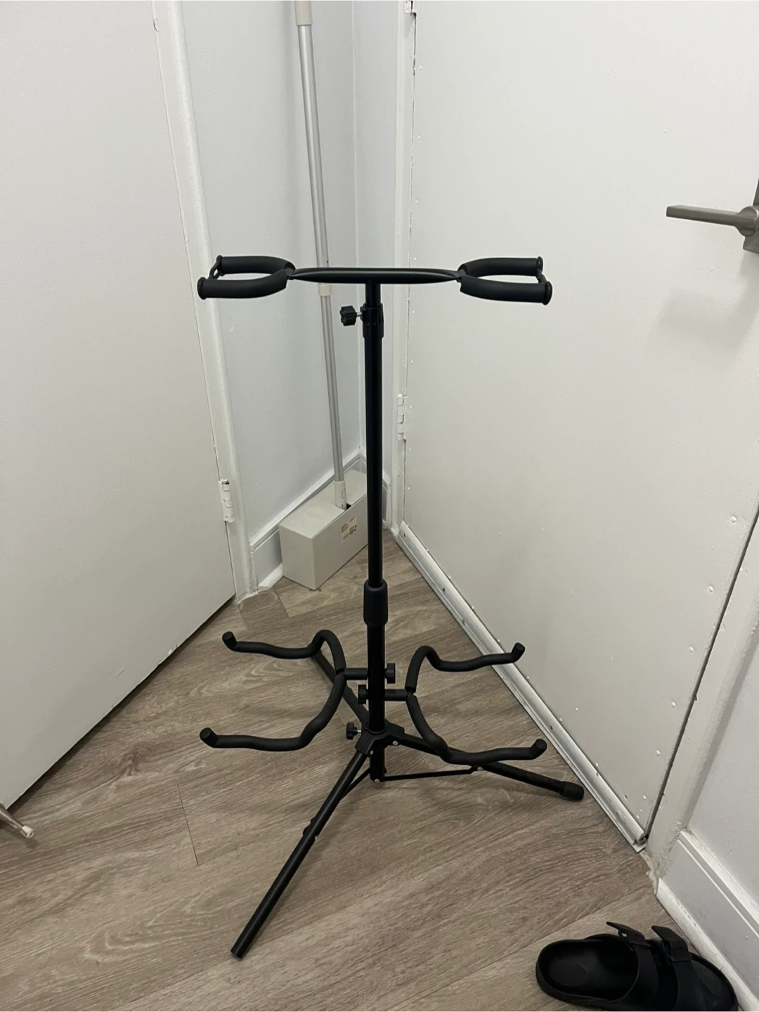 Selling a CAHAYA guitar stand! It's a folding tripod floor stand with two neck holders. It's universal and can hold acoustic, electric, ukulele, violin, banjo, and mandolin guitars. The model number is CY0321. Originally listed for $65.99.
