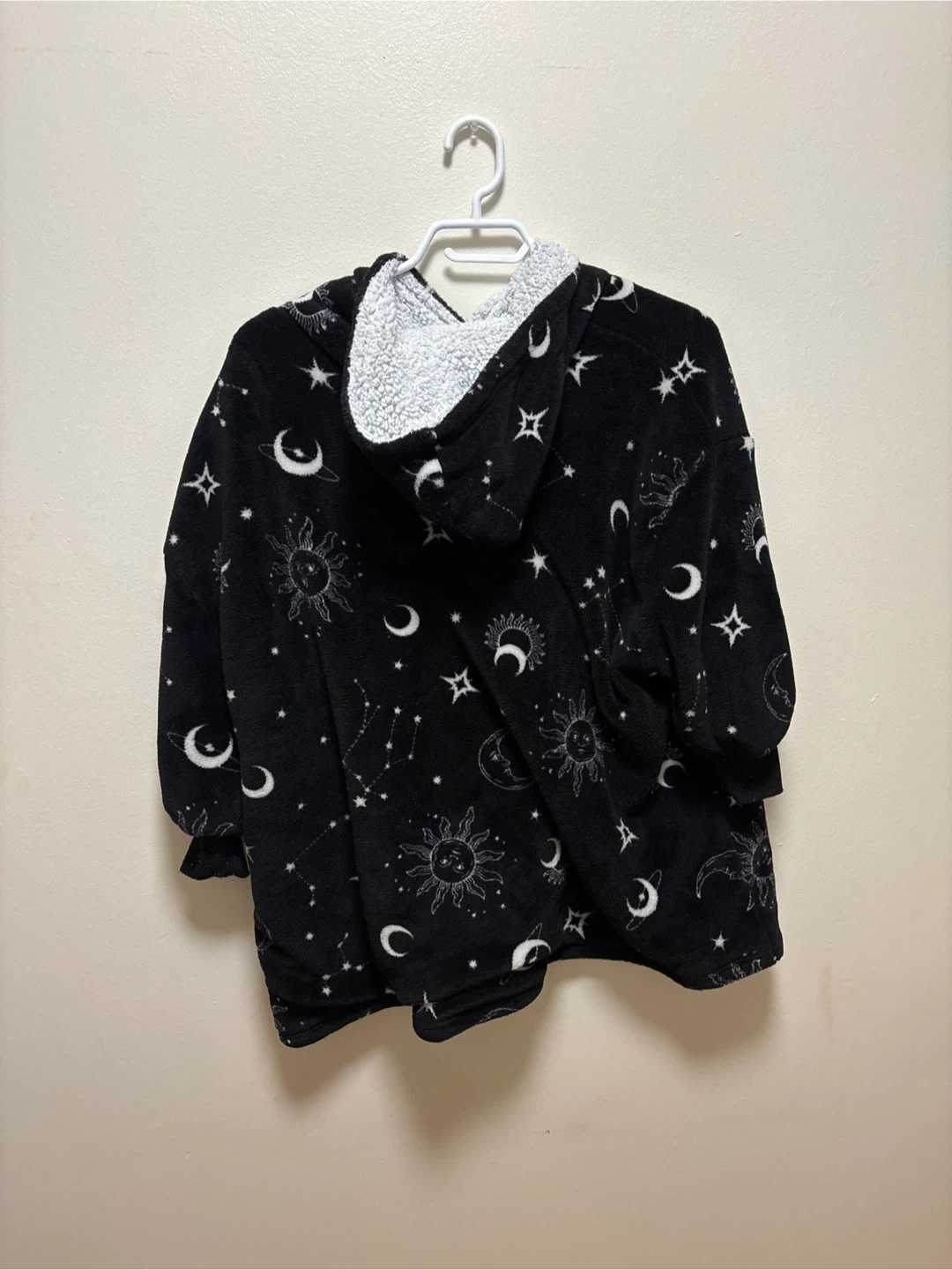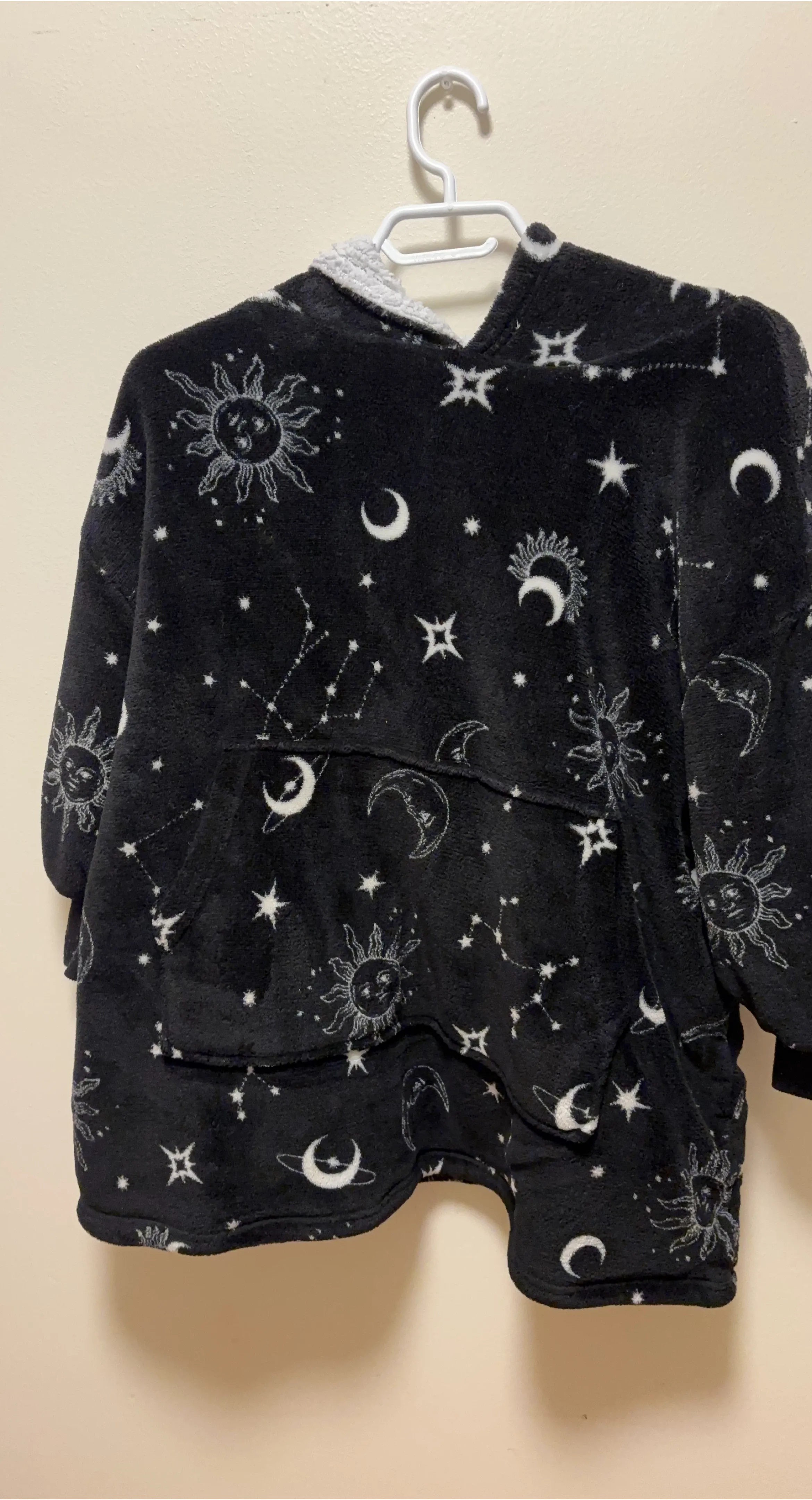 Super soft black hooded blanket with a celestial print featuring moons, stars, and suns. It's lined with fluffy sherpa for extra warmth. This oversized hoodie is perfect for chilly evenings!