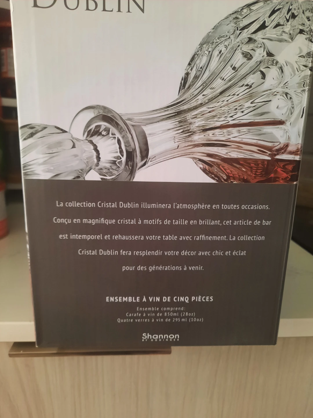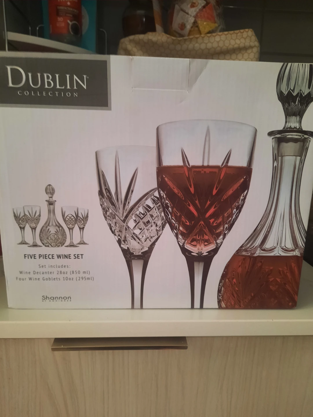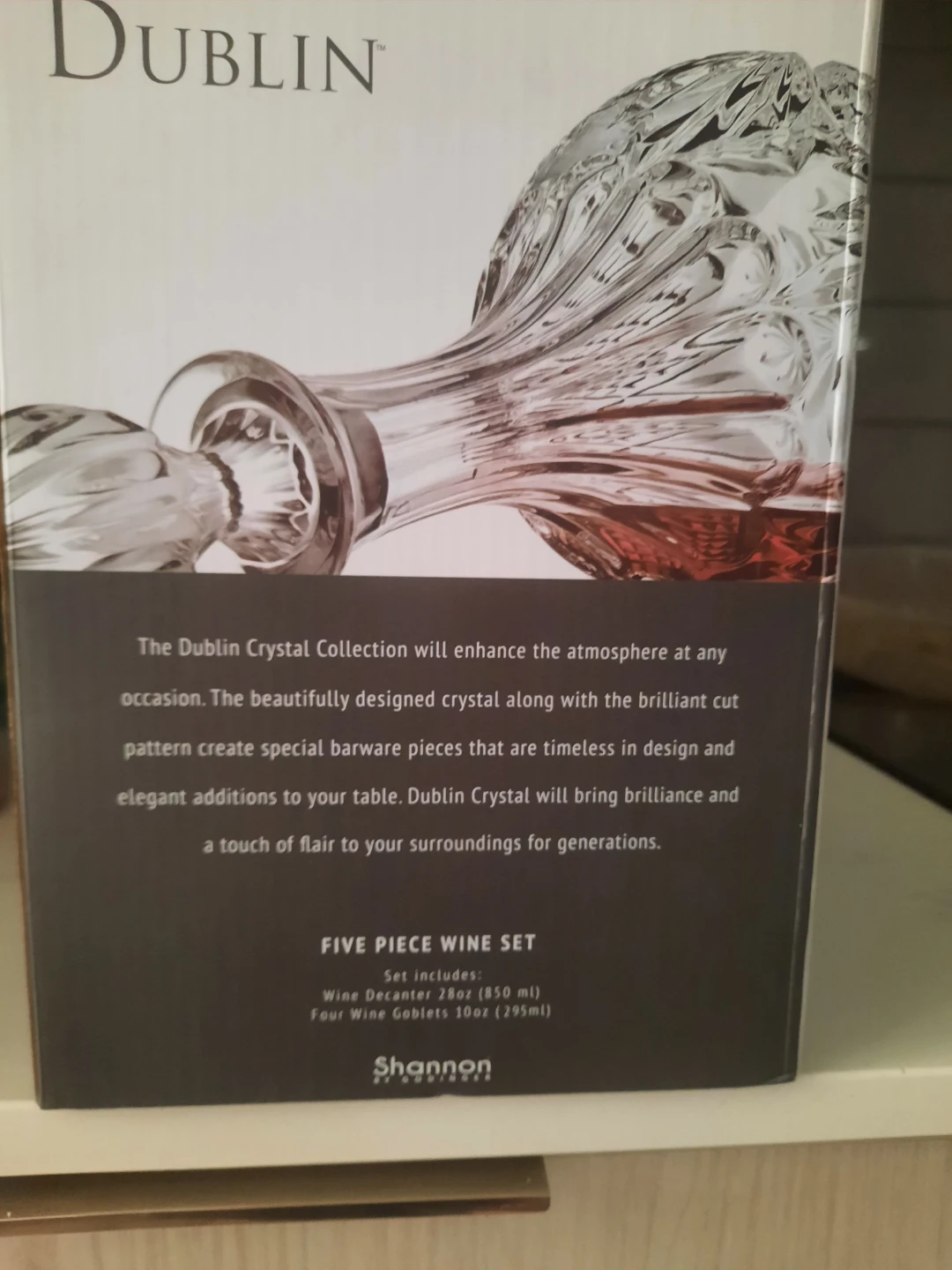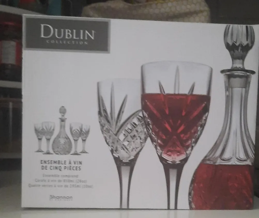 Selling a brand new Dublin Collection five-piece wine set. The set includes a wine decanter (28oz/850ml) and four wine goblets (10oz/295ml). The Dublin Crystal Collection will enhance the atmosphere at any occasion. The beautifully designed crystal, along with the brilliant cut pattern, creates special barware pieces that are timeless in design and elegant additions to your table. Dublin Crystal will bring brilliance and a touch of flair to your surroundings for generations