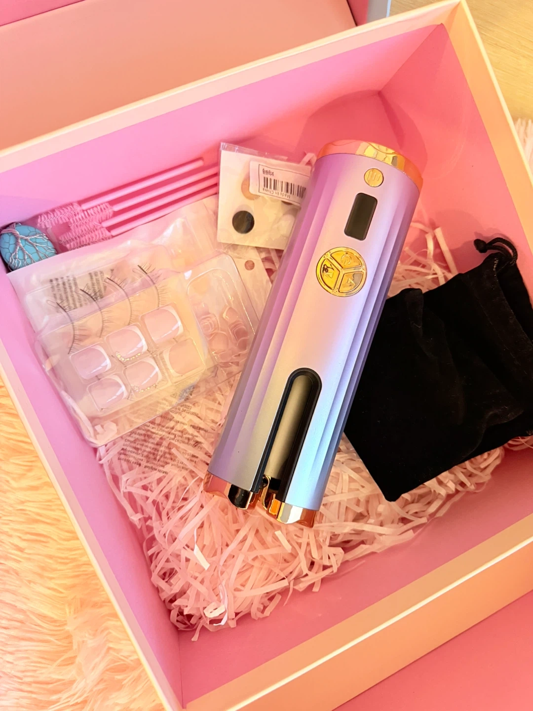 This automatic hair curler set comes with a cordless curling wand and styling accessories. It's designed for creating curls on the go. Includes a charging cable and storage pouch.