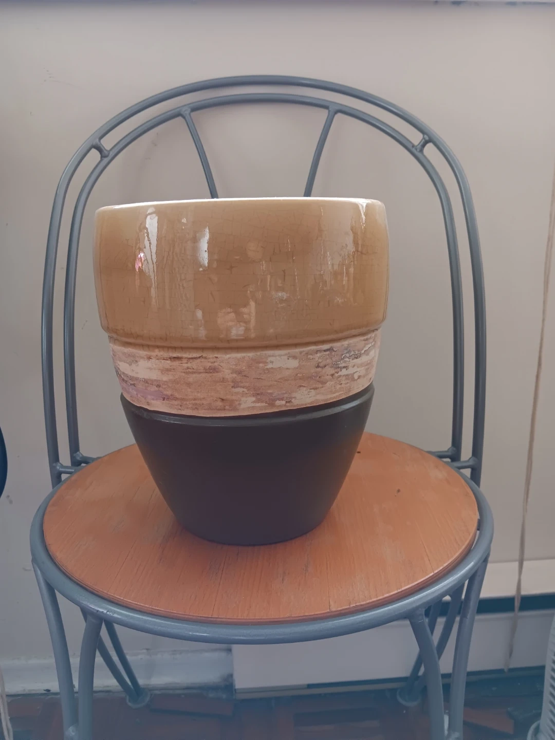 A medium to large size glazed ceramic plant pot. Middle part was covered with sisal, but can be painted or stained.