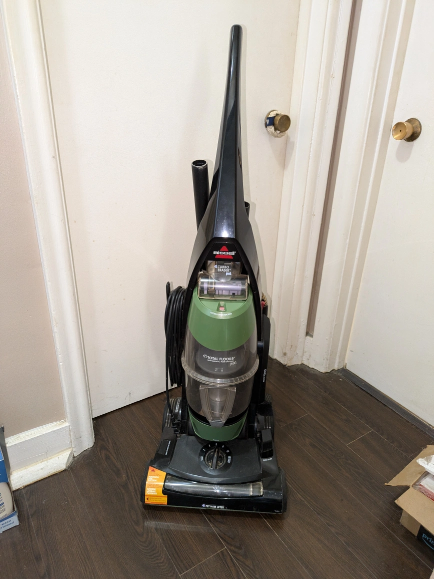 A green and black Bissell Total Floors Vacuum. includes all accessories. Bag free... great pet hair vacuum...