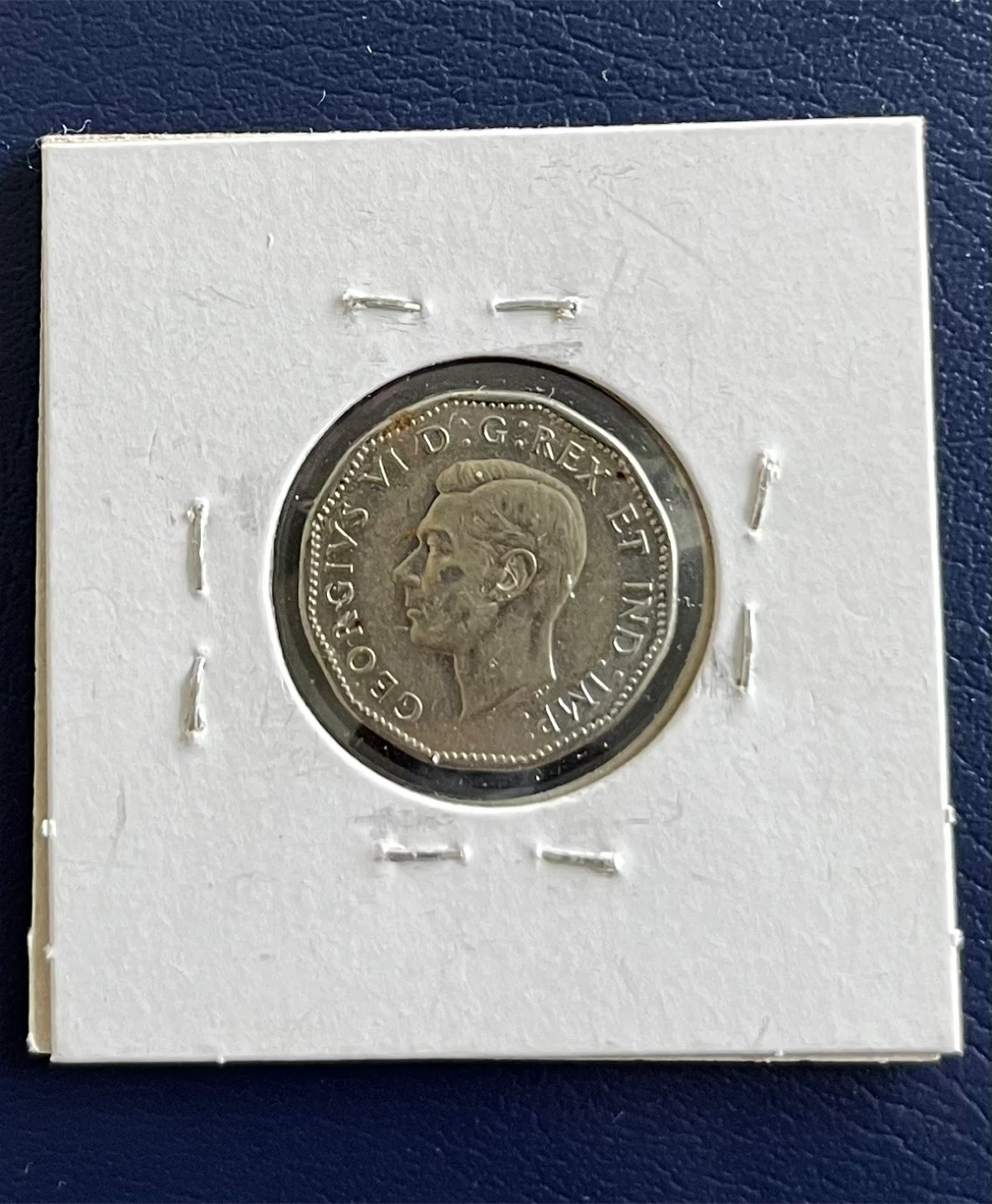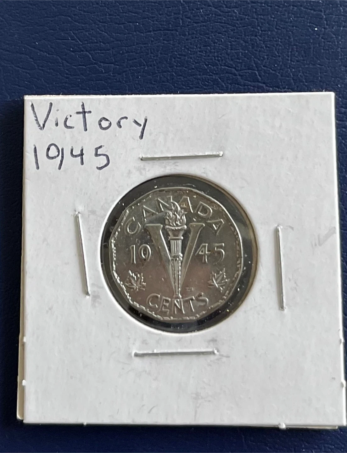 This is a Canadian 1945 Victory V nickel. It features King George VI on the obverse and a V for Victory design on the reverse. The coin is mounted in a protective sleeve.