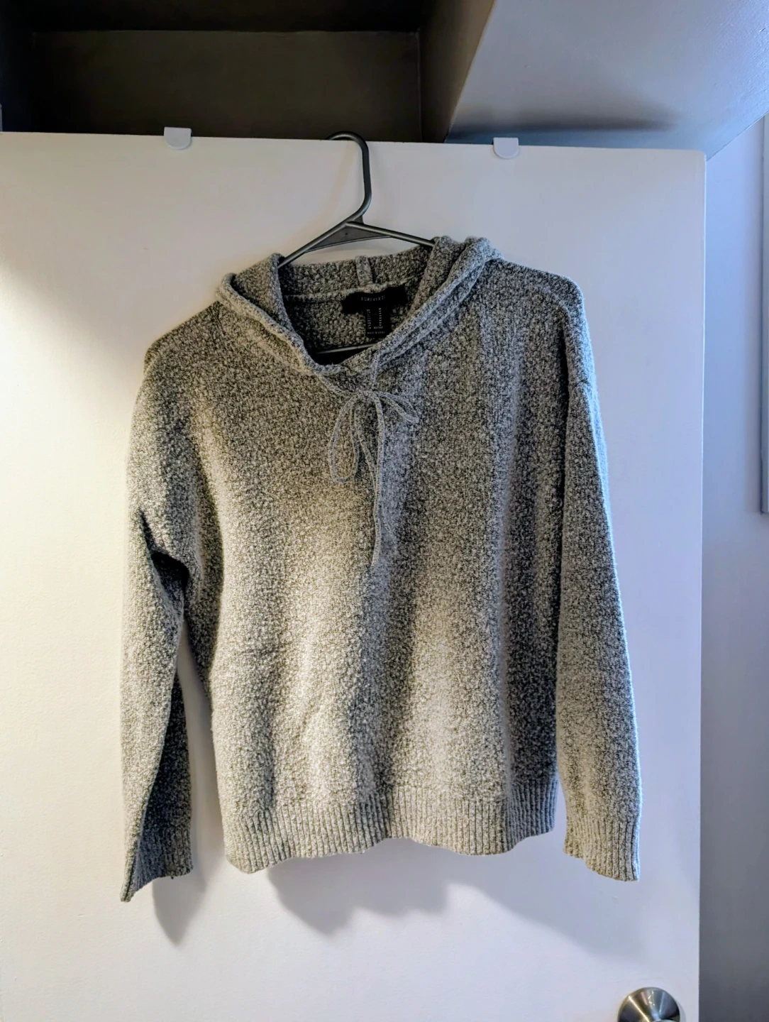 This is a Forever 21 marled grey hoodie. It's made of a soft, textured knit material with a drawstring hood and a kangaroo pocket. Perfect for casual wear on cooler days!