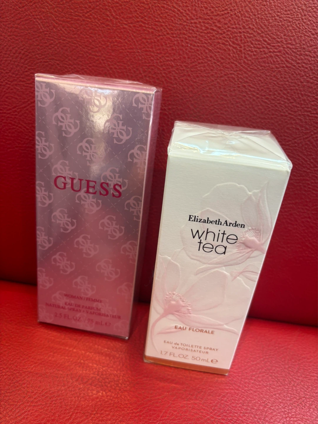 Includes Guess Woman Eau de Parfum Natural Spray 75 mL and Elizabeth Arden White Tea Eau Florale Eau de Toilette Spray 50 mL. Both are sealed.