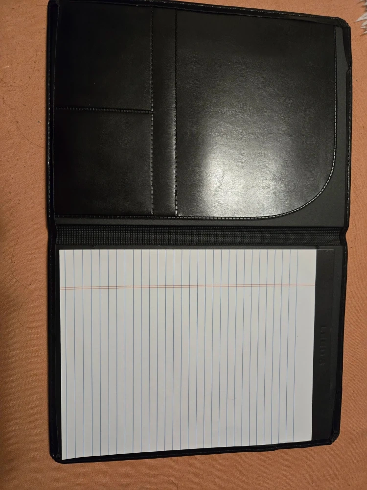 Selling a black leather padfolio in great condition. It has a sleek and professional look, perfect for meetings or taking notes on the go. The padfolio includes a notepad and has slots for cards and documents. It's a stylish and practical accessory to keep you organized