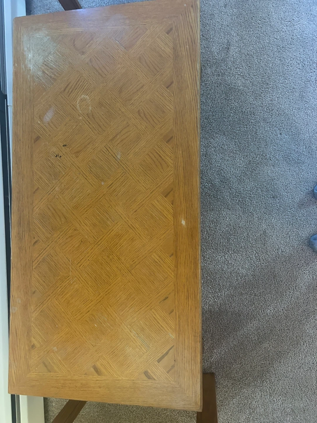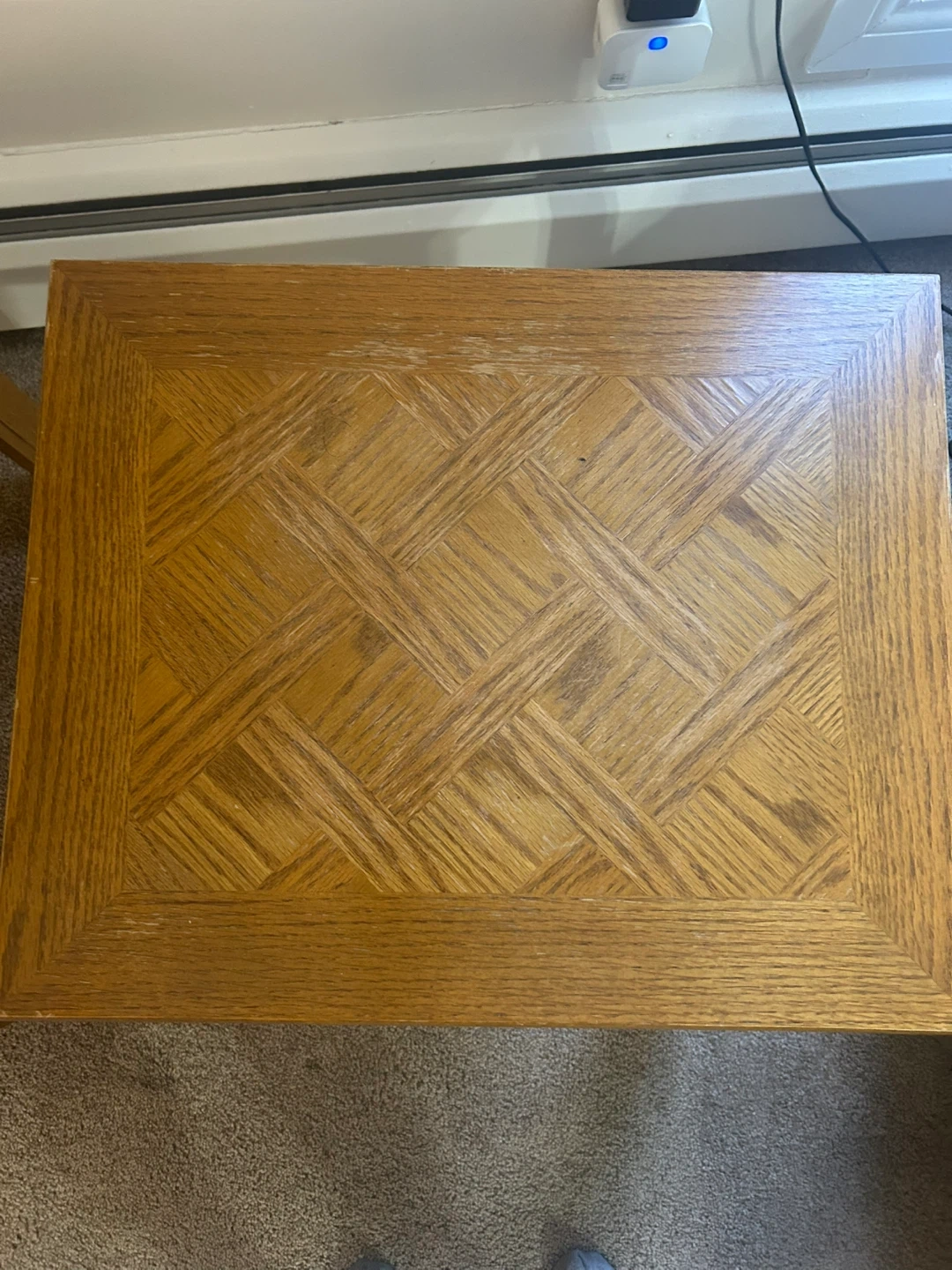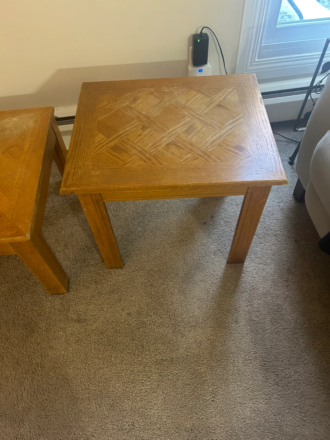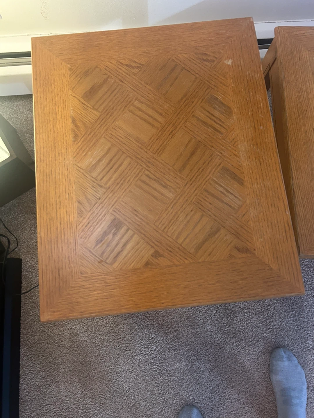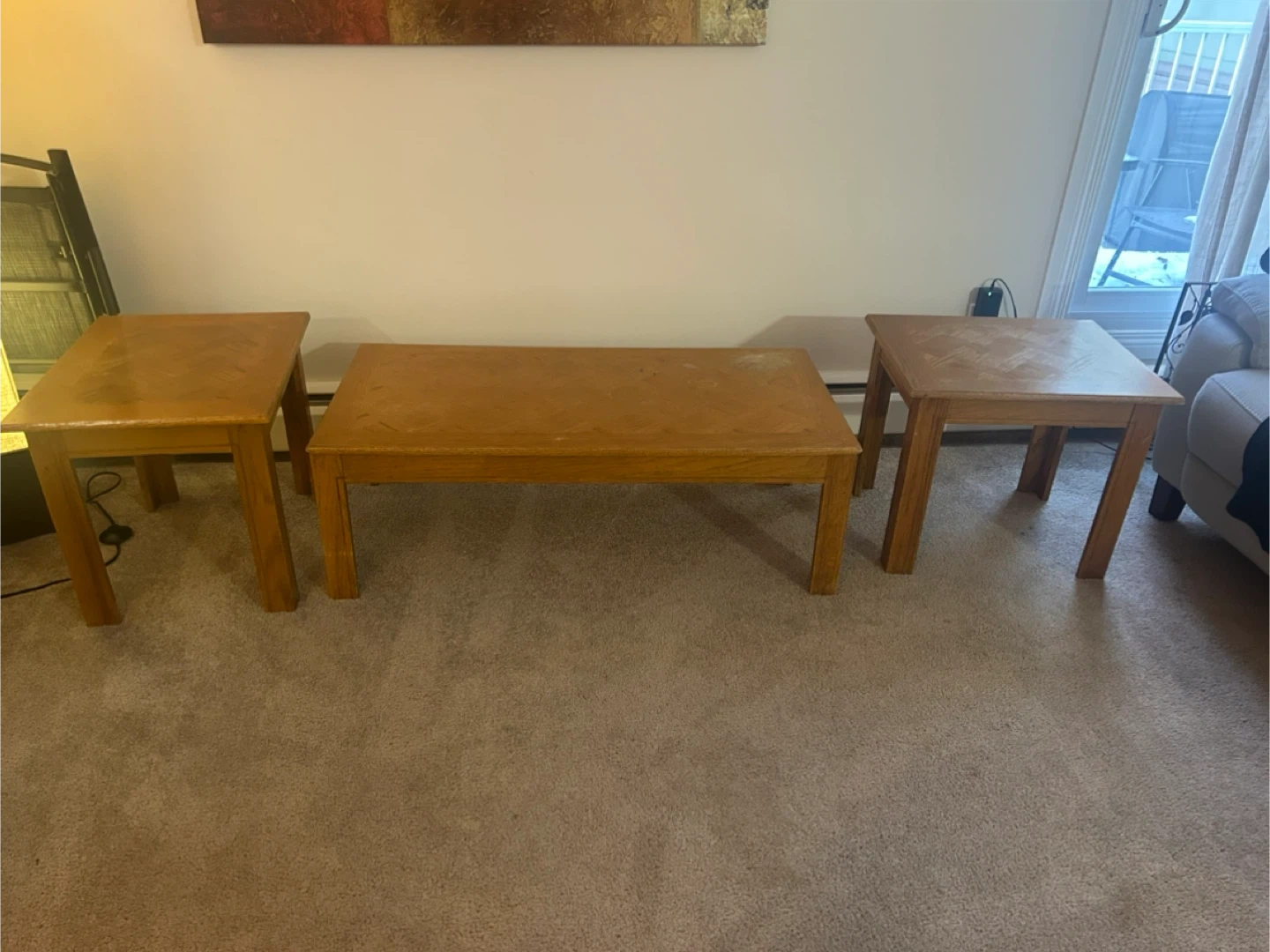 Selling a set of three wooden tables: a coffee table and two end tables. They're sturdy and have a nice wood grain pattern on top. Perfect for a living room or family room setup!