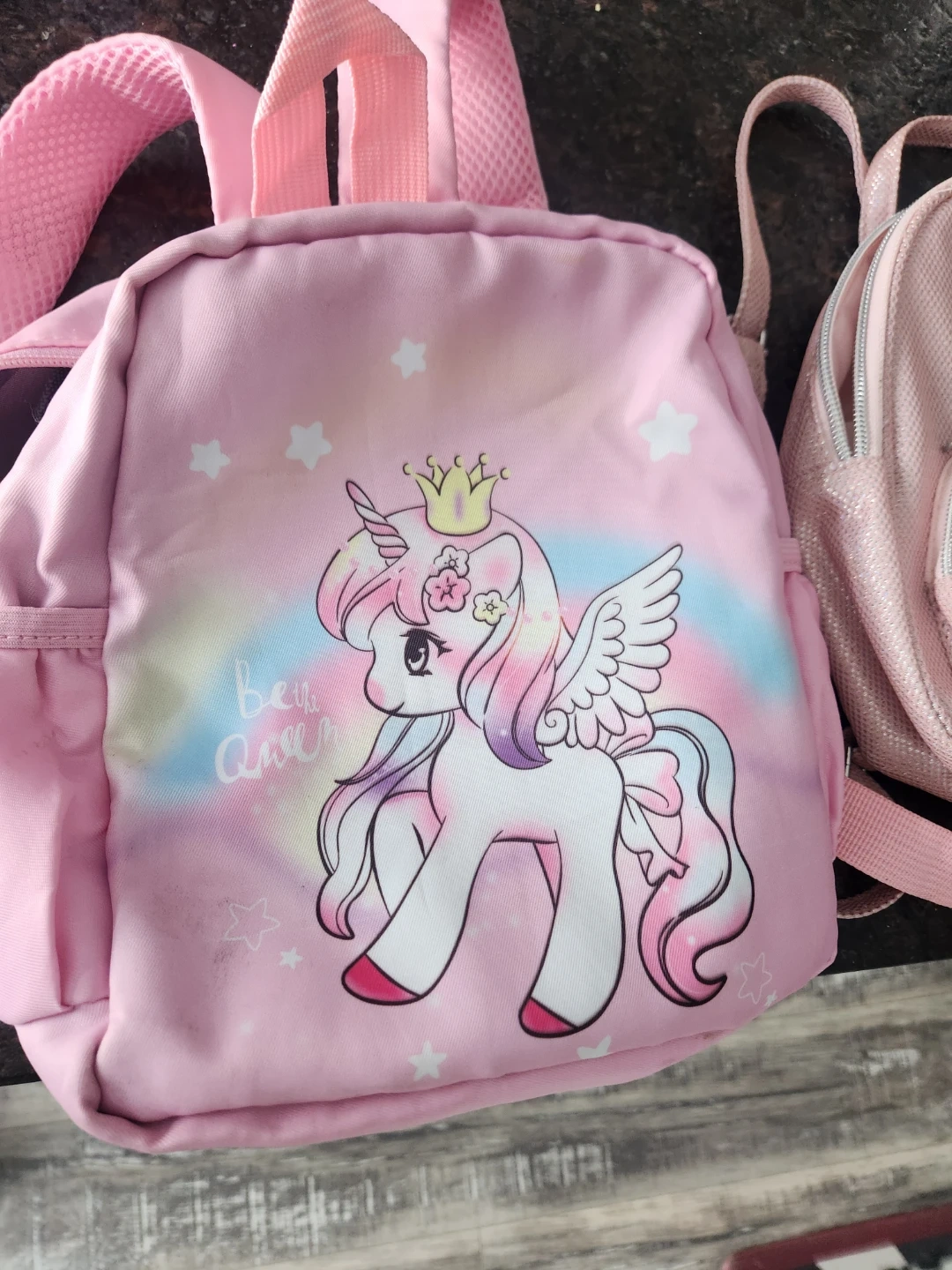 Adorable pink backpack with a fun unicorn graphic. It's one size fits all and perfect for little ones. Made with a durable polyester shell and lining.