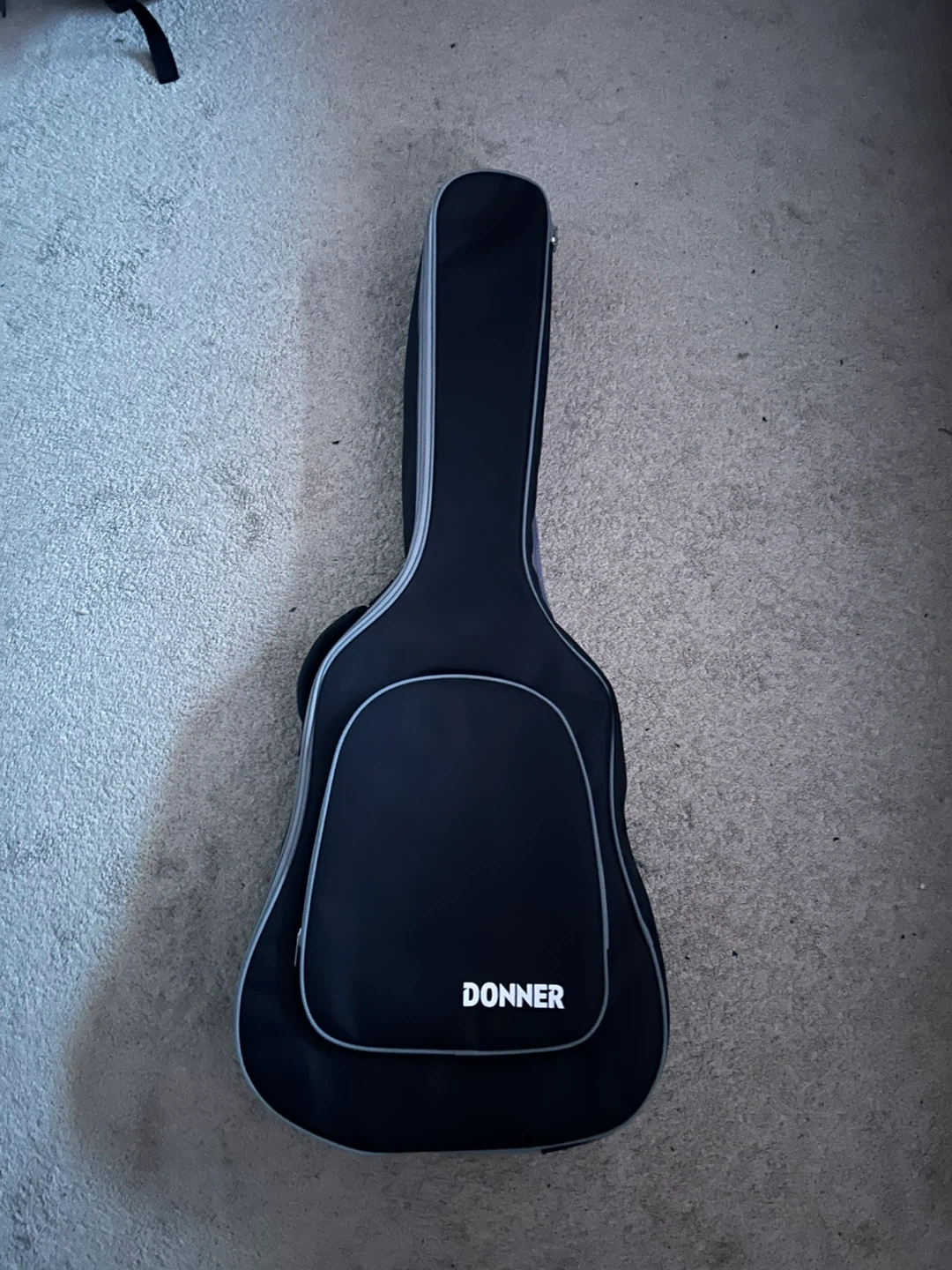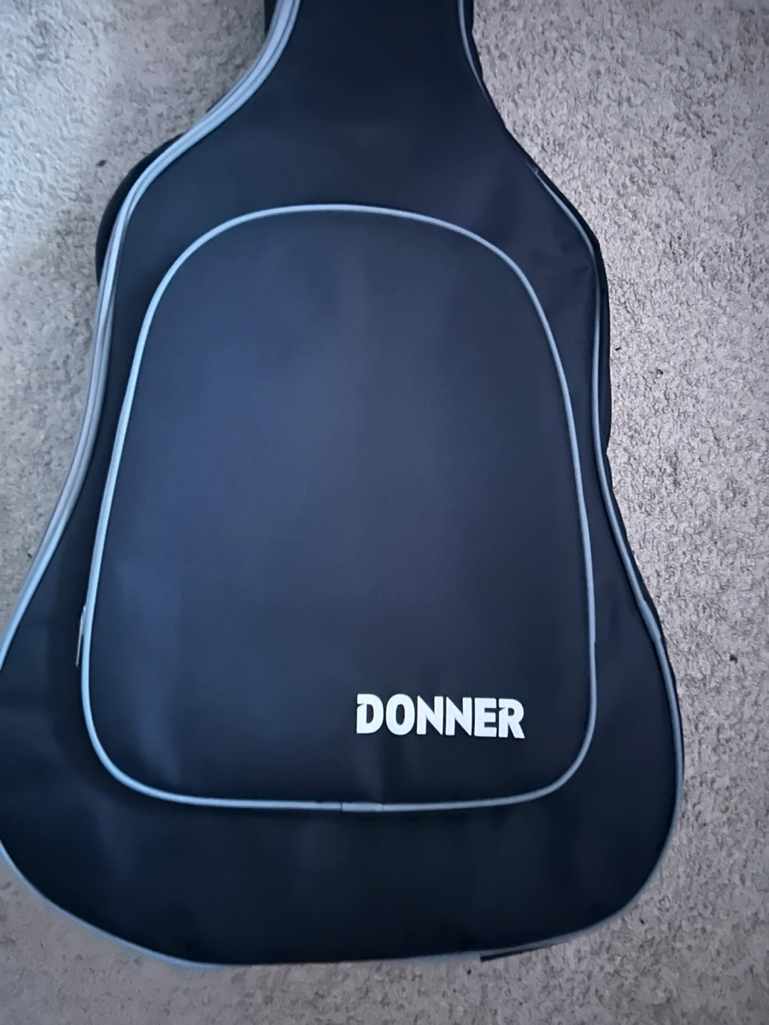 Donner acoustic guitar in a sunburst finish. It comes with a padded gig bag for protection and transport. This guitar is suitable for beginners or intermediate players looking for a new instrument.