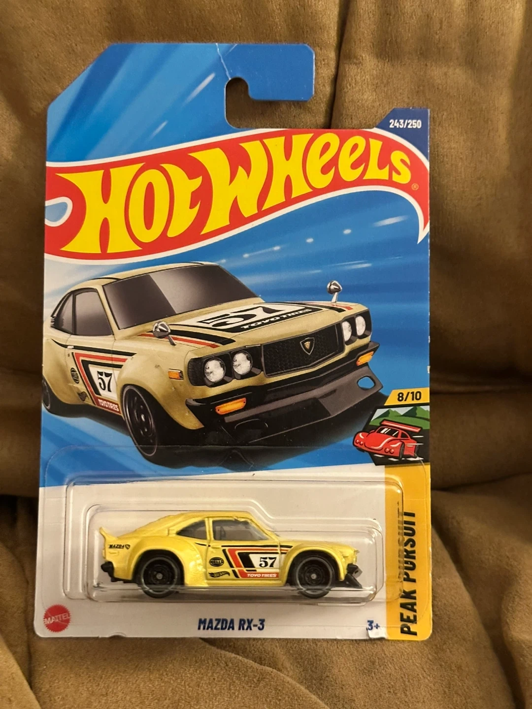A new Hot Wheels Mazda RX-3 in yellow and orange. These diecast cars are 1:64 scale. Great for collectors!