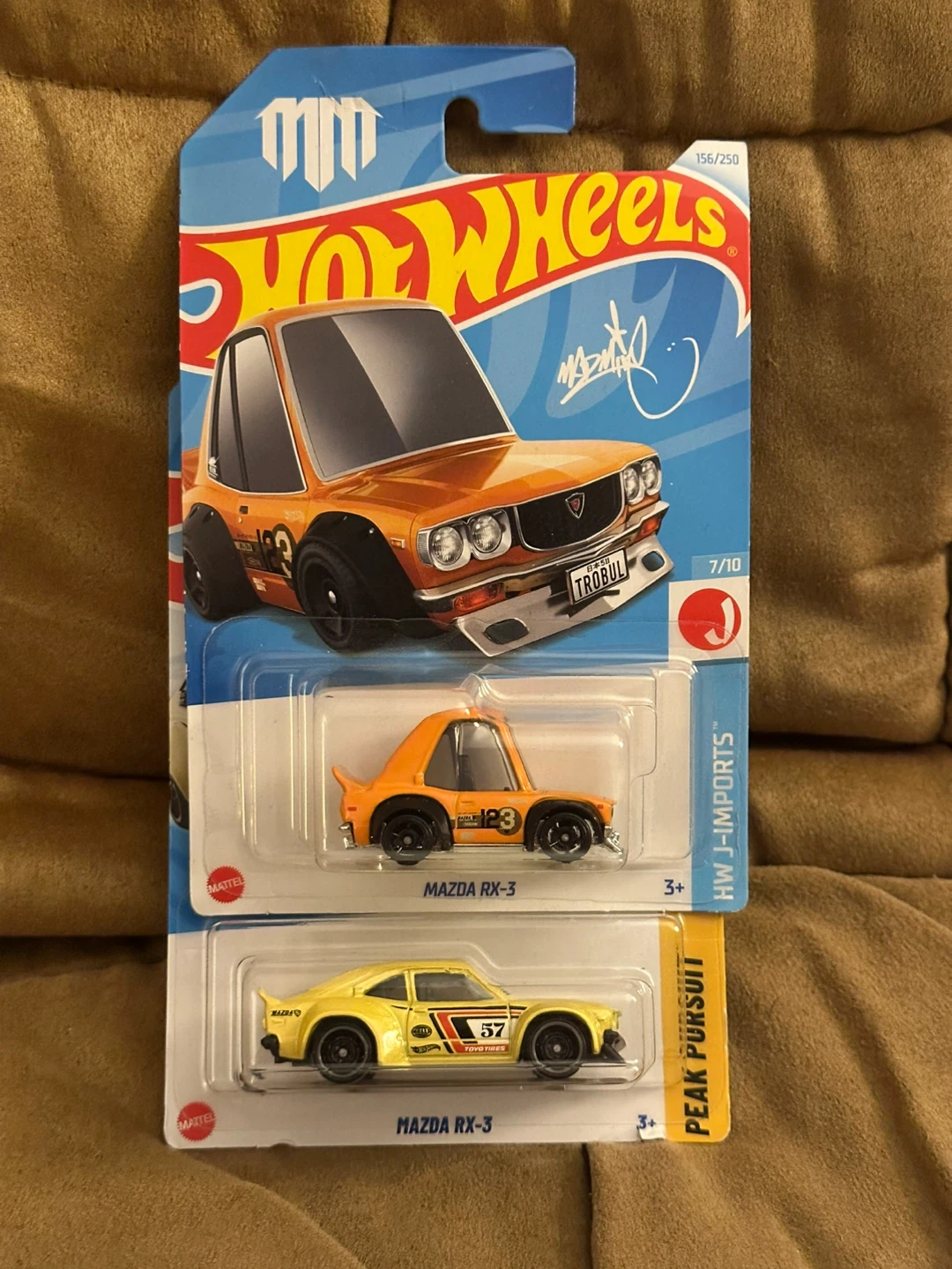 A new Hot Wheels Mazda RX-3 in yellow and orange. These diecast cars are 1:64 scale. Great for collectors!