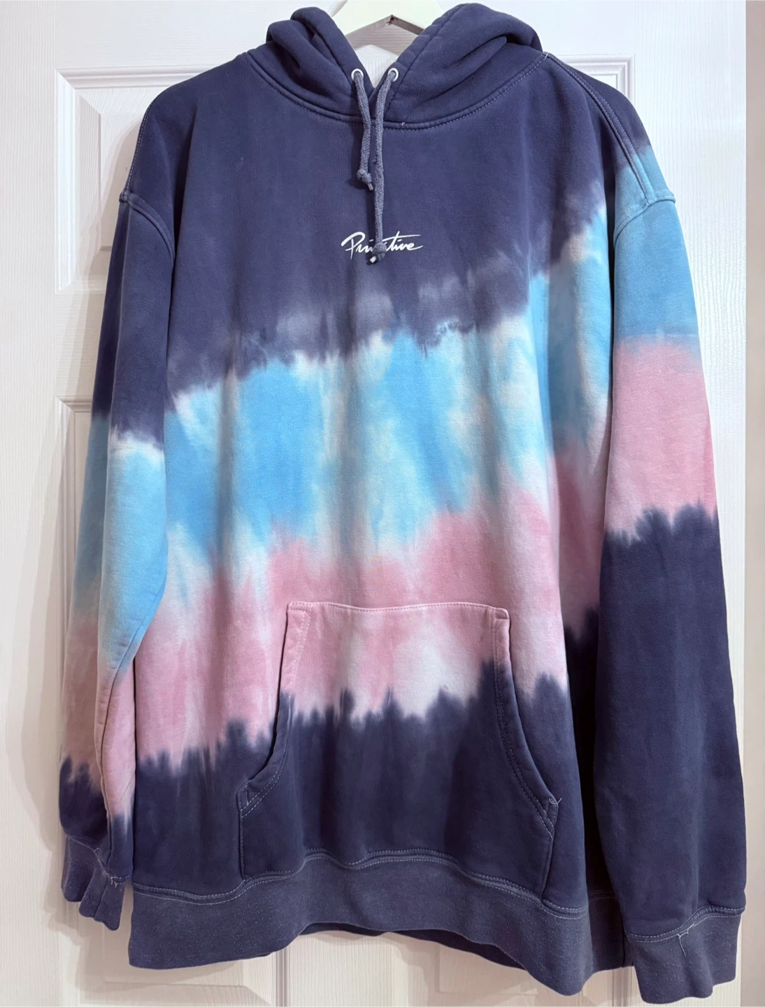 This Primitive hoodie features a tie-dye pattern with Sailor Moon graphics on the back. It's a size large and made of a comfortable cotton blend. A great piece for fans of the anime!