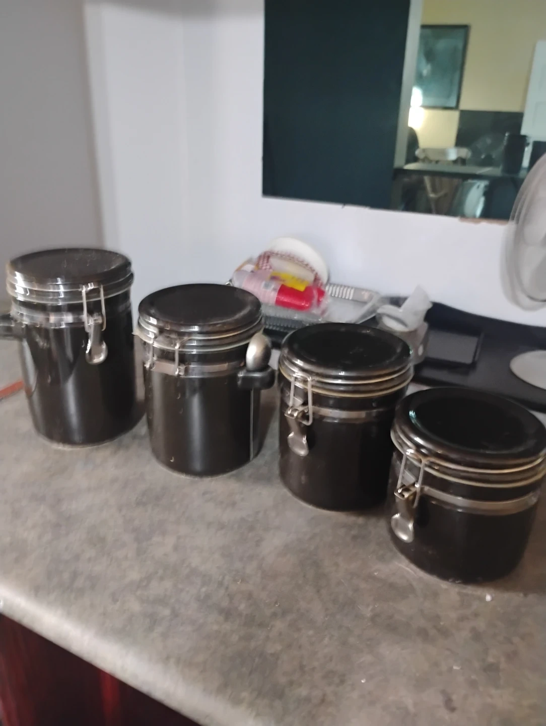A set of four black canisters for kitchen storage. They feature a silver latch closure for a secure seal. Great for coffee, tea, or other dry goods!