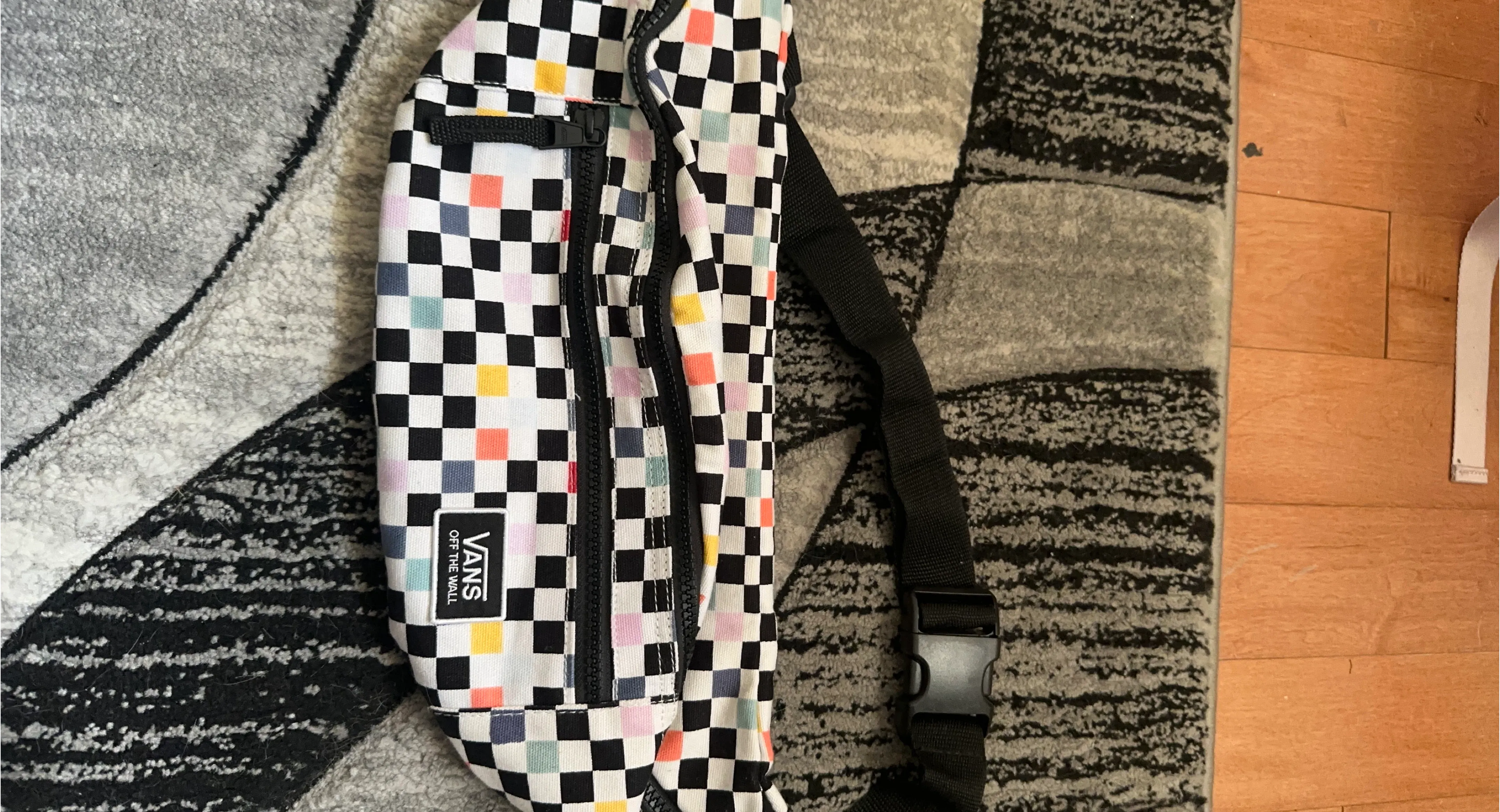 This is a Vans "Off The Wall" fanny pack in a checkerboard print. Holds a large amount of things, It has a zippered main compartment and an adjustable strap with a buckle closure. Great for carrying essentials on the go!