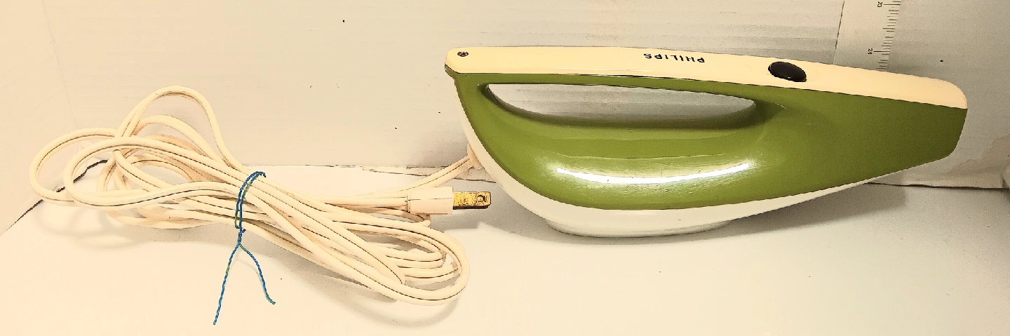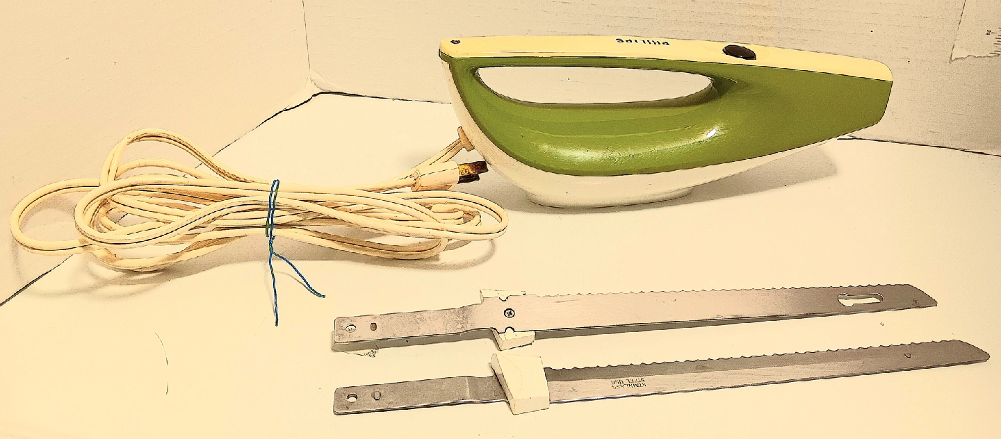 This is a Philips Electric Knife with a green and white handle, perfect for carving up that Sunday roast, turkey, or ham. The item is used but in excellent condition and comes with the blade attachments as pictured.