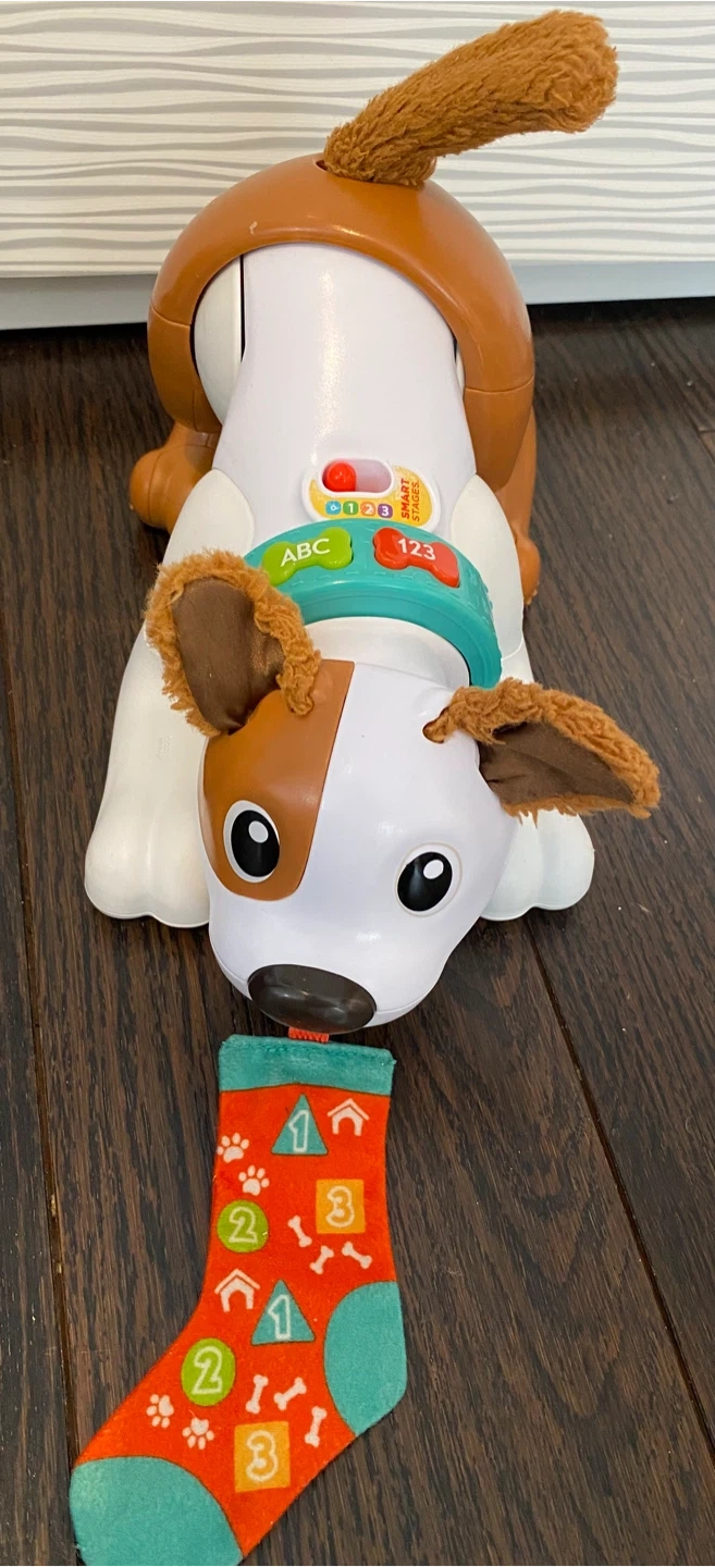 Fisher-Price Smart Stages Learning Puppy toy. It has ABC and 123 buttons that respond with lights and sounds. This puppy is designed to help toddlers learn letters, numbers, and songs. Suitable for young children learning to interact with toys.
