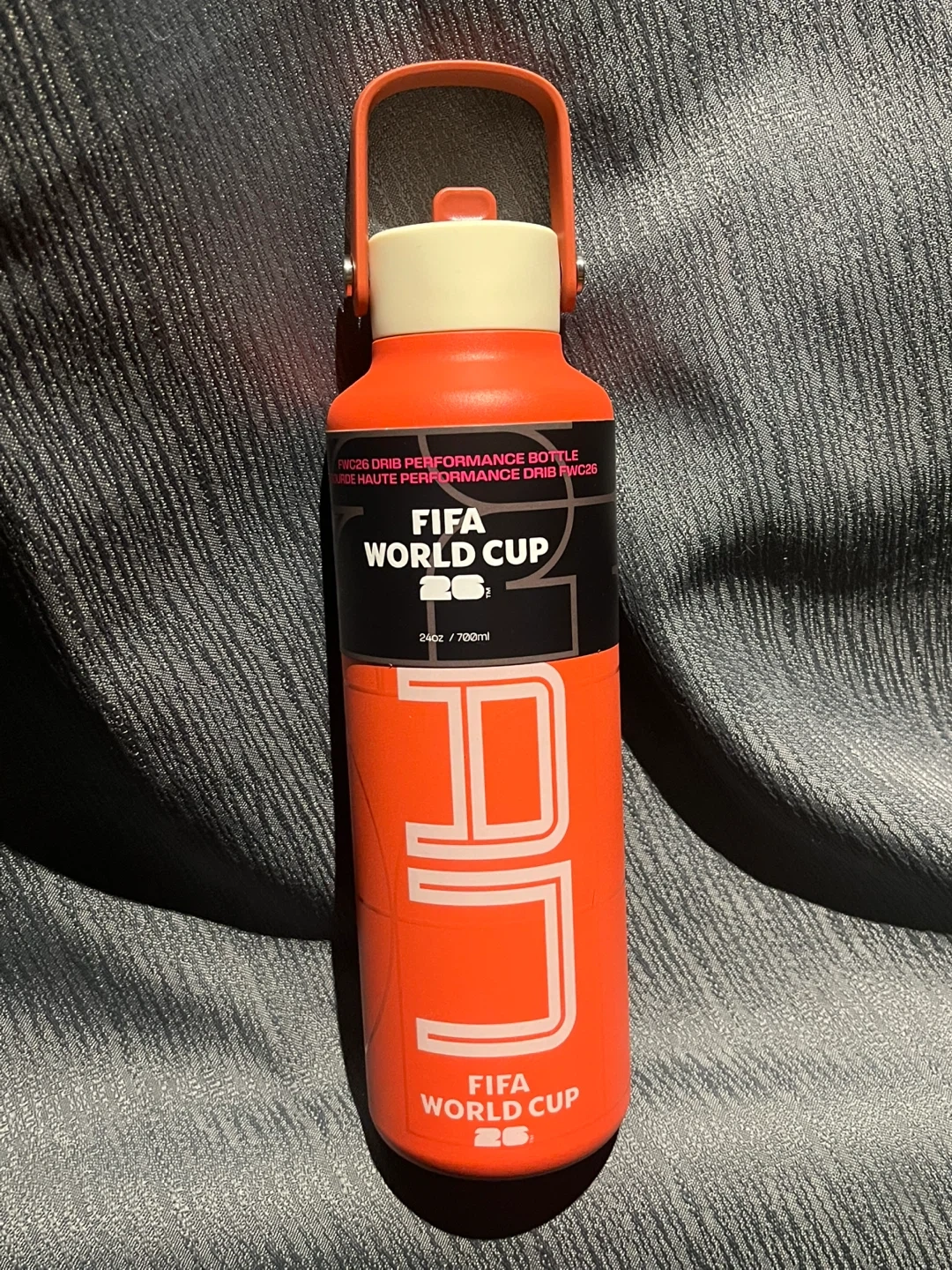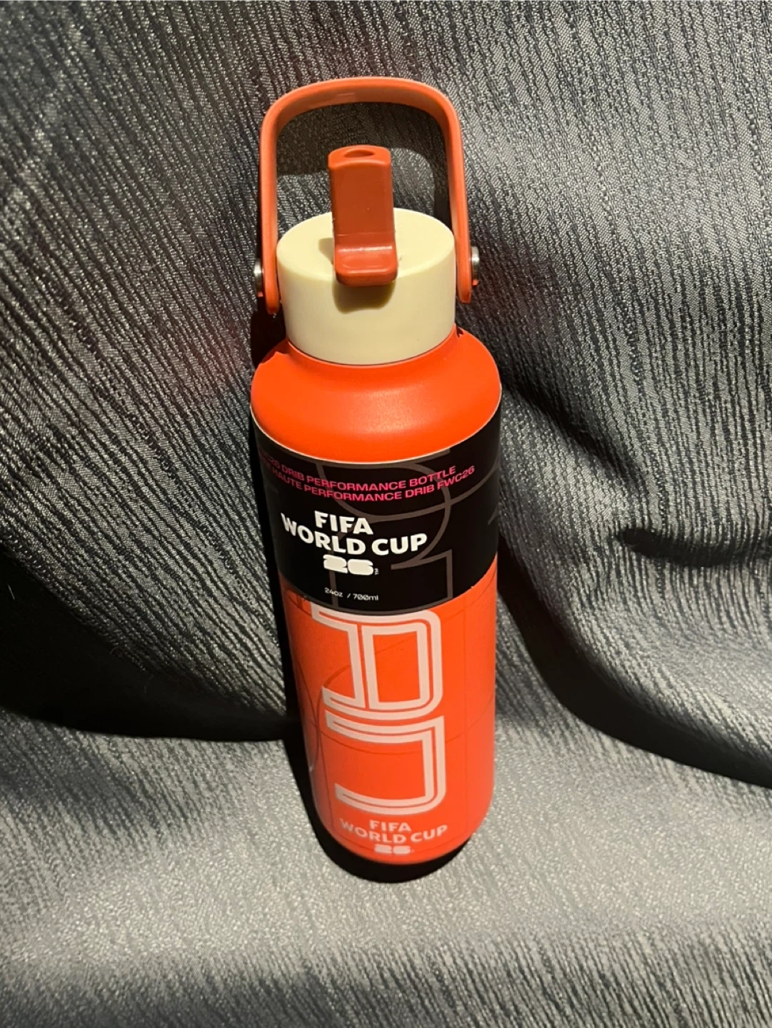 This is a FIFA World Cup 26 performance water bottle. It's orange and has a 700ml capacity. Includes a convenient carrying handle.