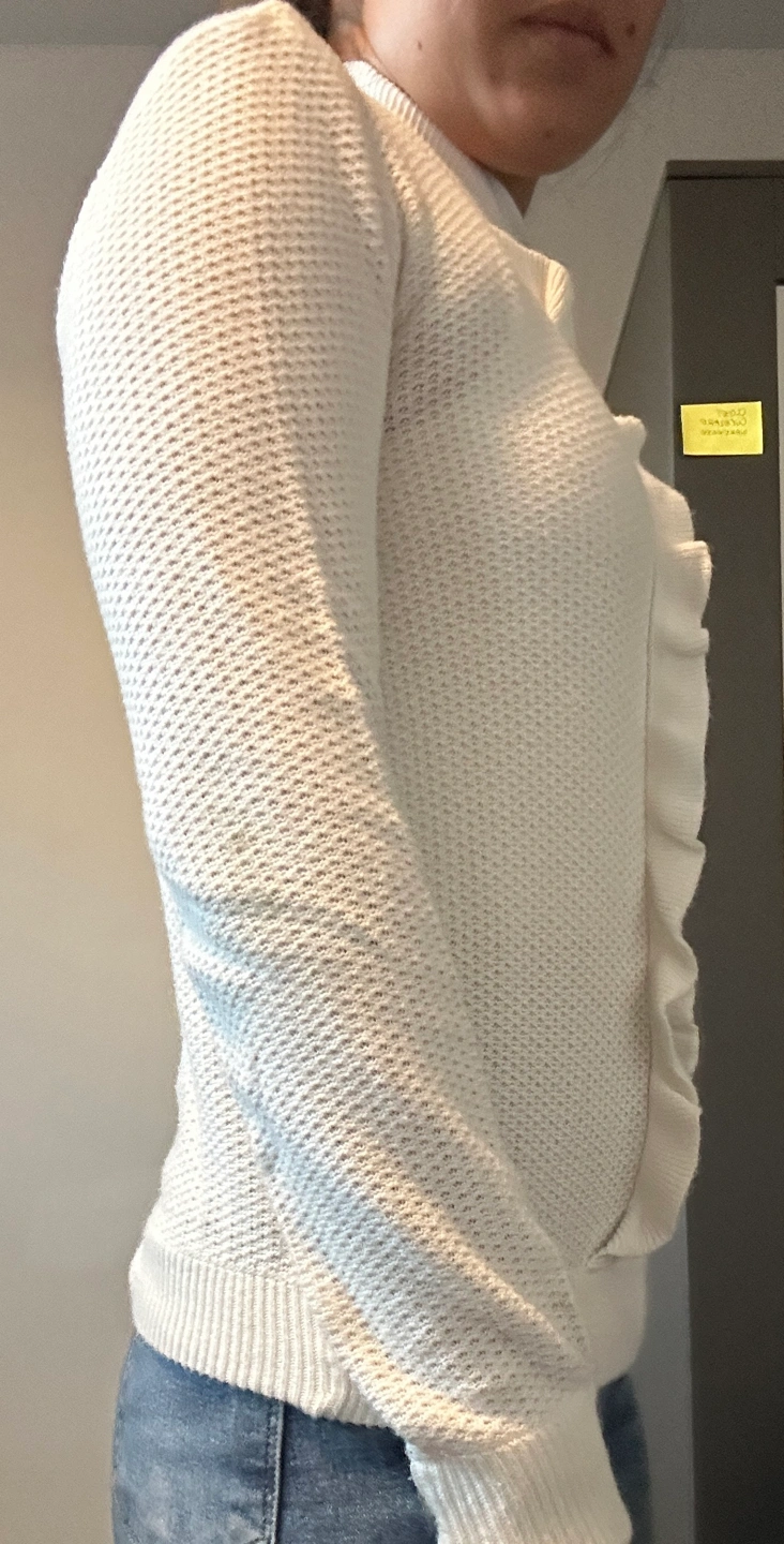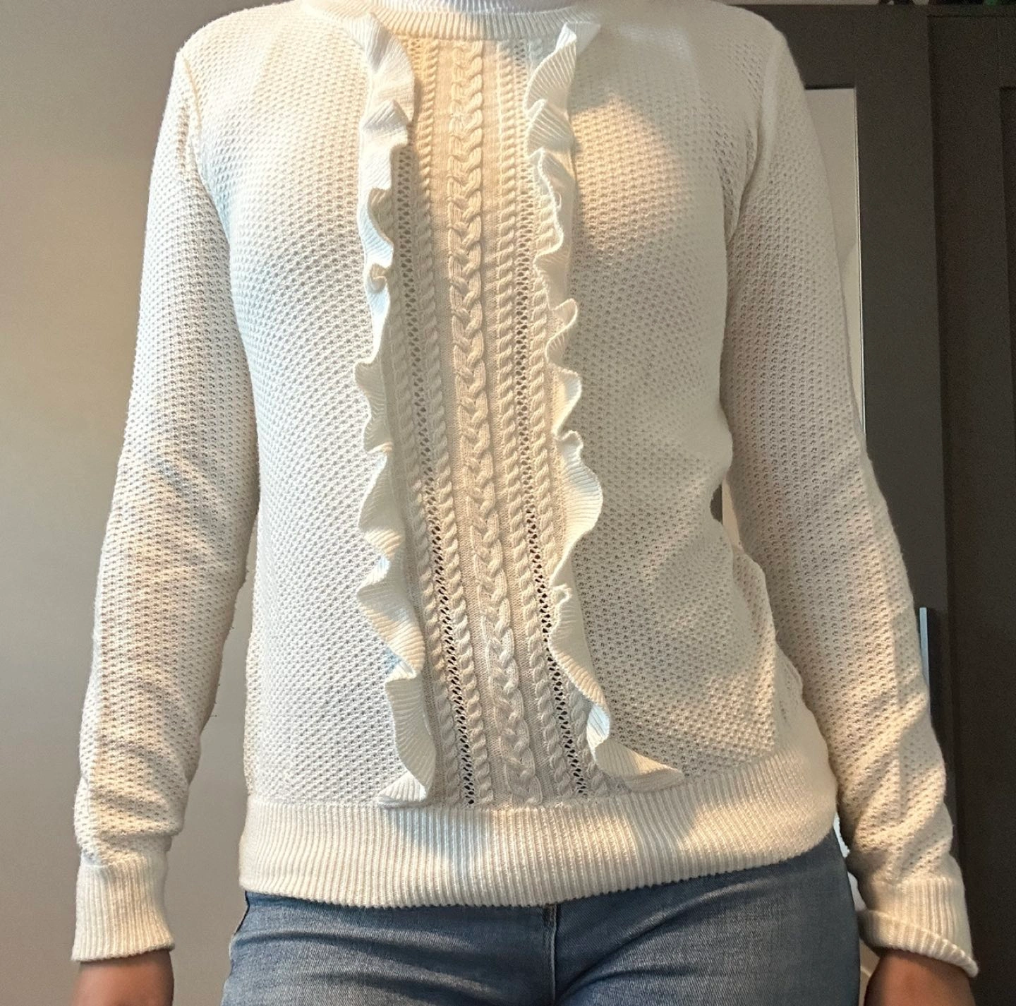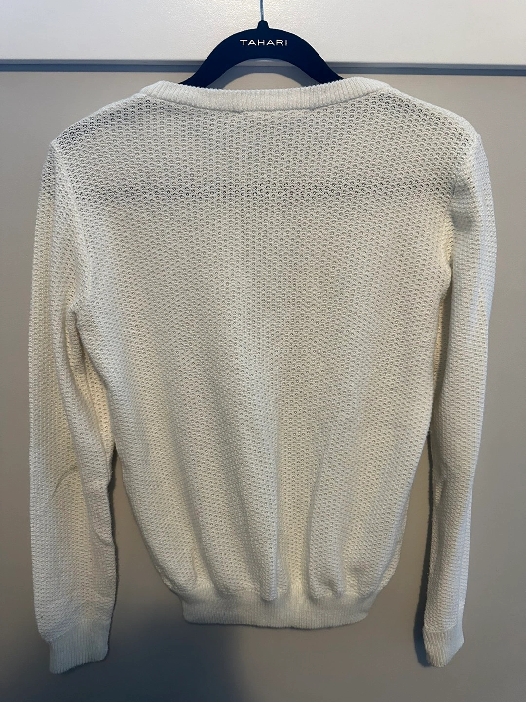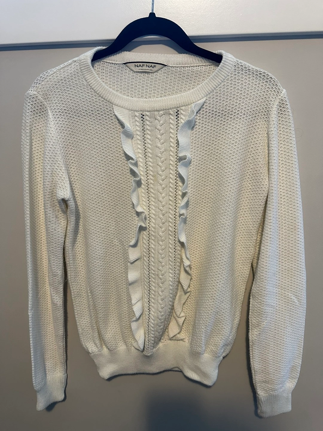 White knitted sweater size s with ribbed cuffs. It has two spots, one on the front and the other on the left elbow as in the image