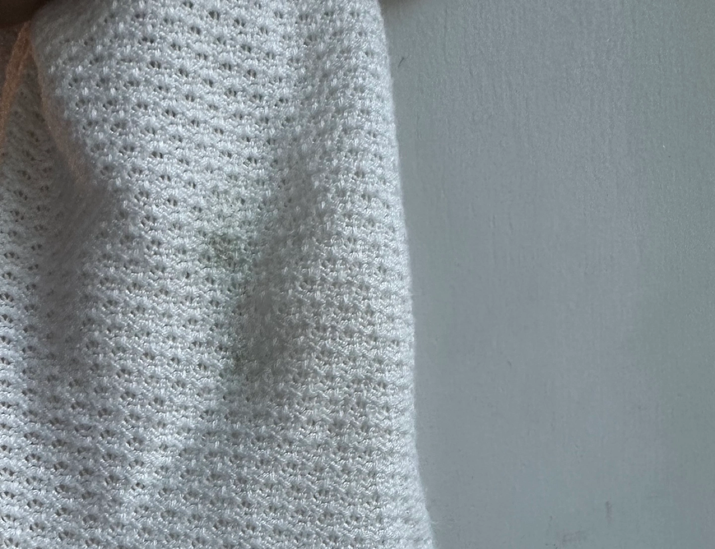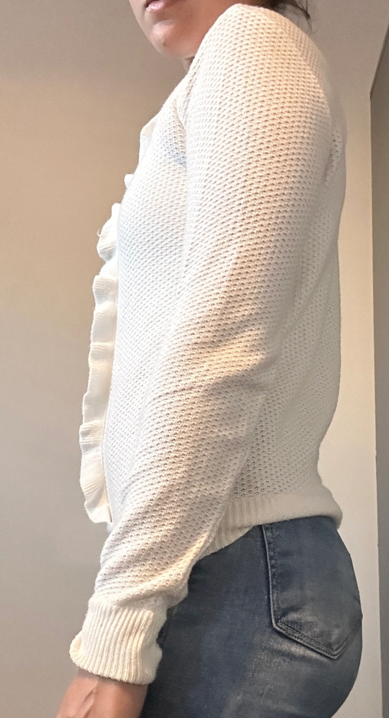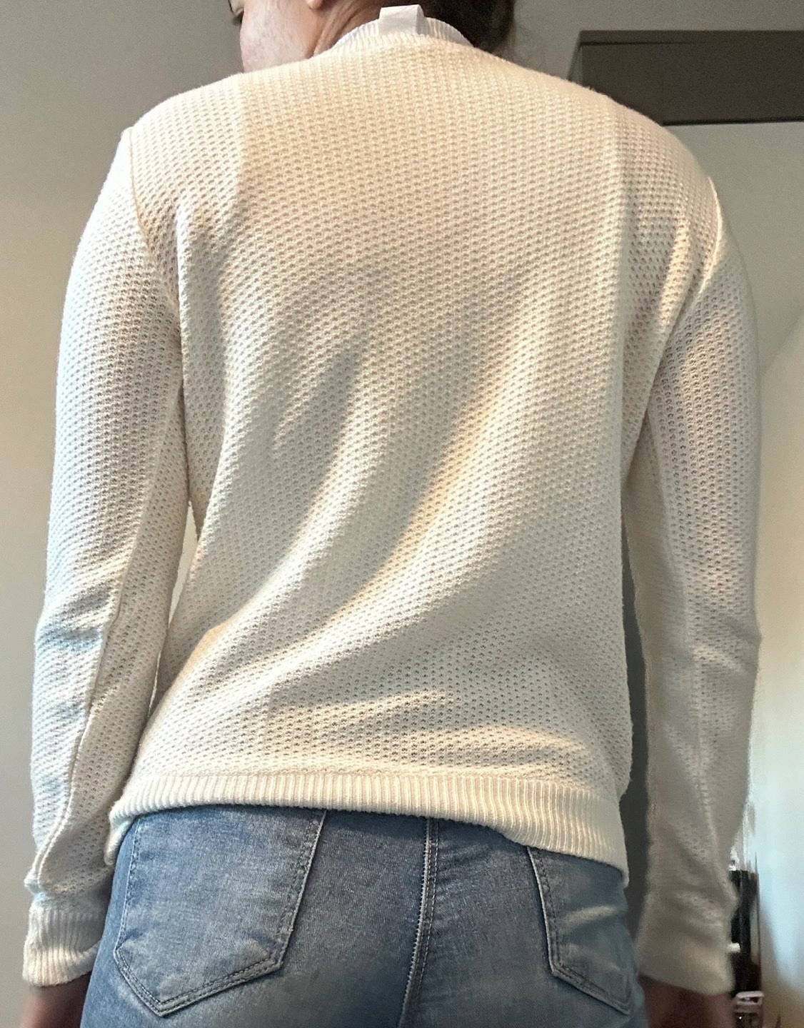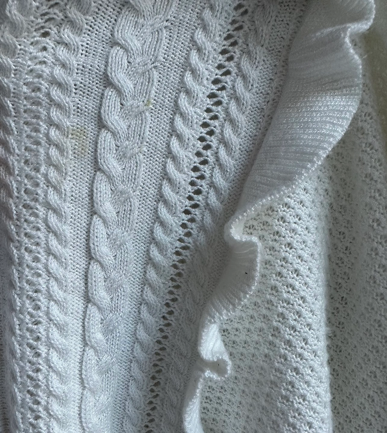 White knitted sweater size s with ribbed cuffs. It has two spots, one on the front and the other on the left elbow as in the image