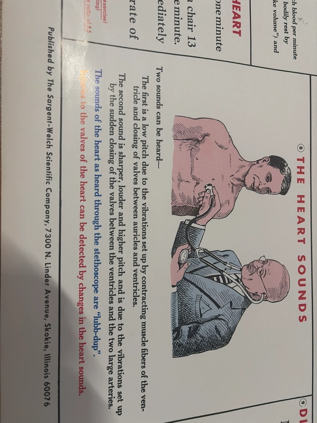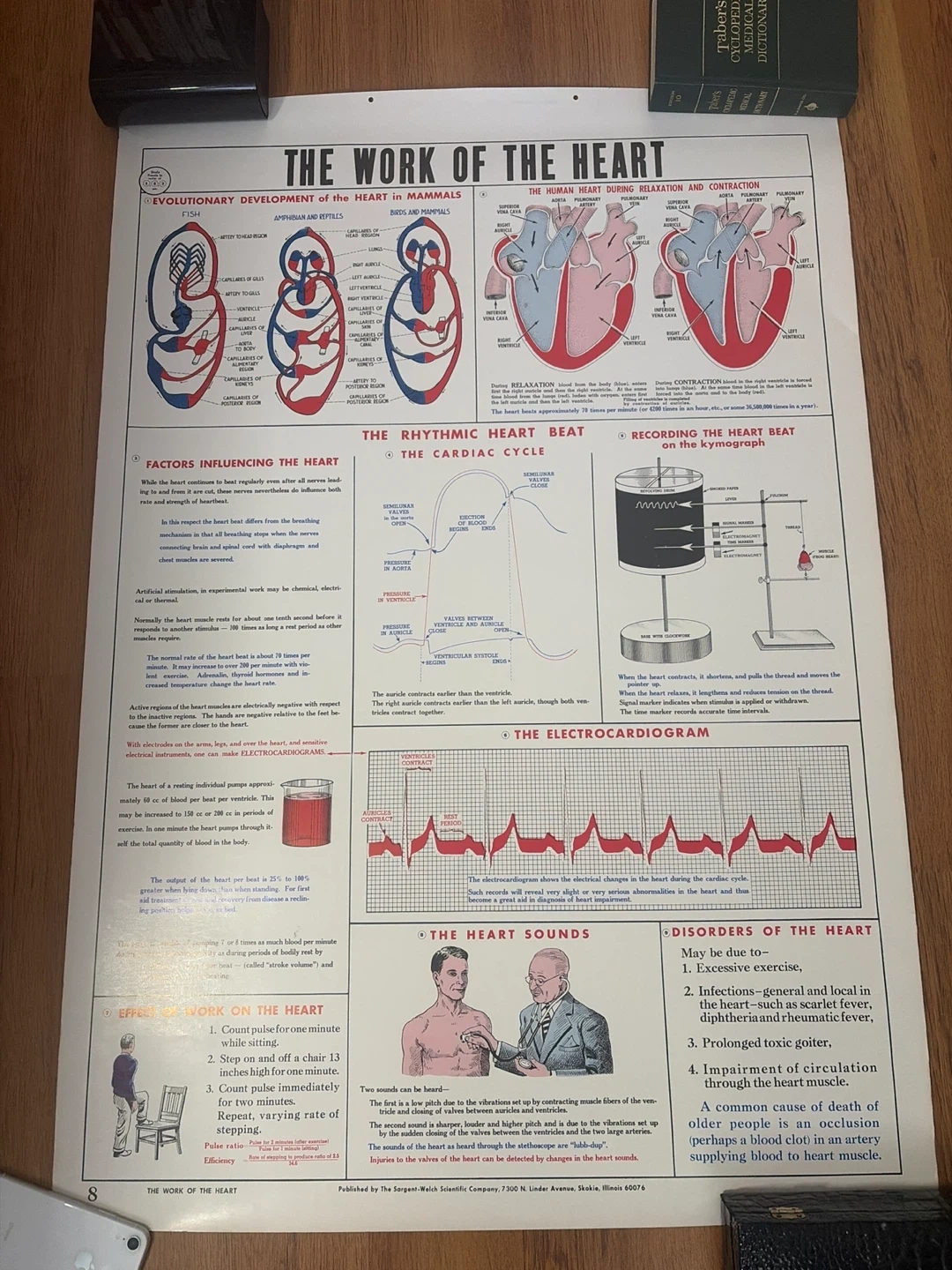 This educational poster illustrates the human heart during relaxation and contraction. It also details the cardiac cycle and the electrocardiogram. The poster covers the work of the heart and heart sounds. Published by The Sargent-Welch Scientific Company.