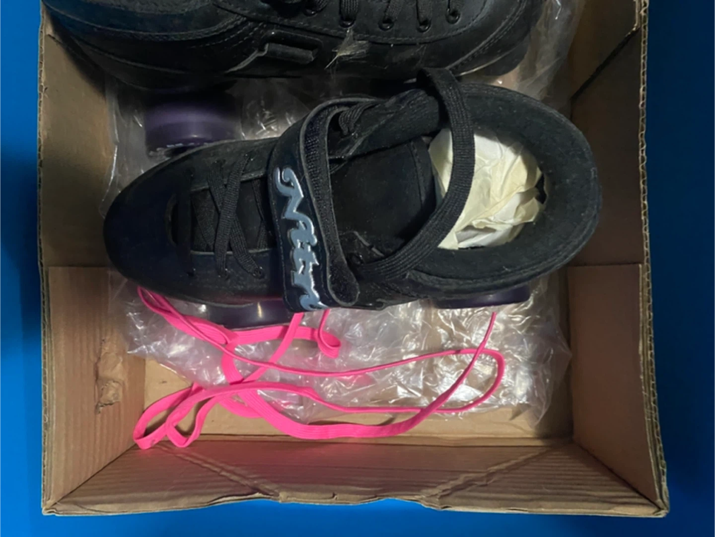 Selling a pair of Nitro roller skates in black. They come with an extra set of pink laces. The original pink wheels are provided but these were upgraded with Fox skate wheels (a lot smoother outside). The skates are in great condition and come in the original box. Sizing is different but they fit my size 7 feet.