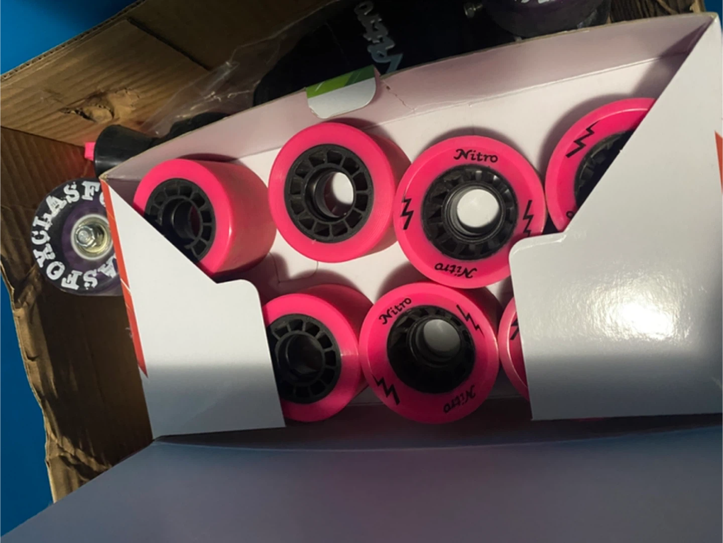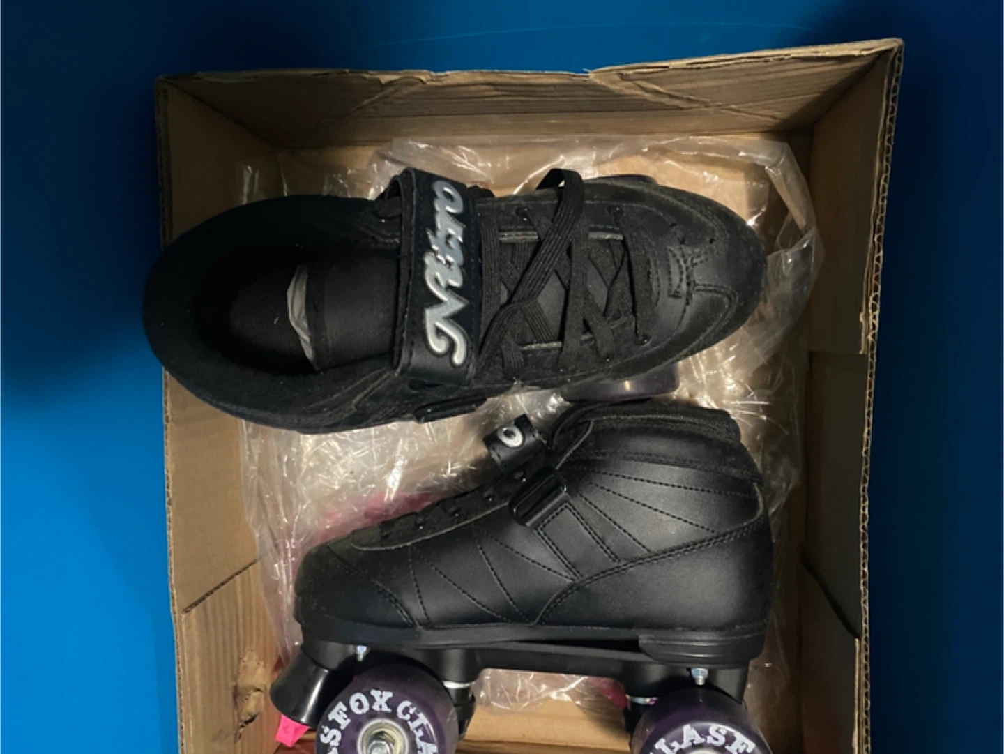 Selling a pair of Nitro roller skates in black. They come with an extra set of pink laces. The original pink wheels are provided but these were upgraded with Fox skate wheels (a lot smoother outside). The skates are in great condition and come in the original box. Sizing is different but they fit my size 7 feet.
