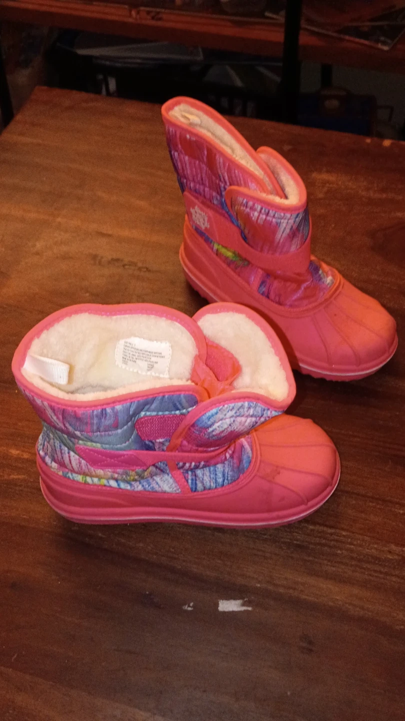 Pick up only. Cozy pink winter boots size 1 with a colourful patterned shaft. These boots are lined with soft fleece for extra warmth. Velcro straps. Worn maybe 2x