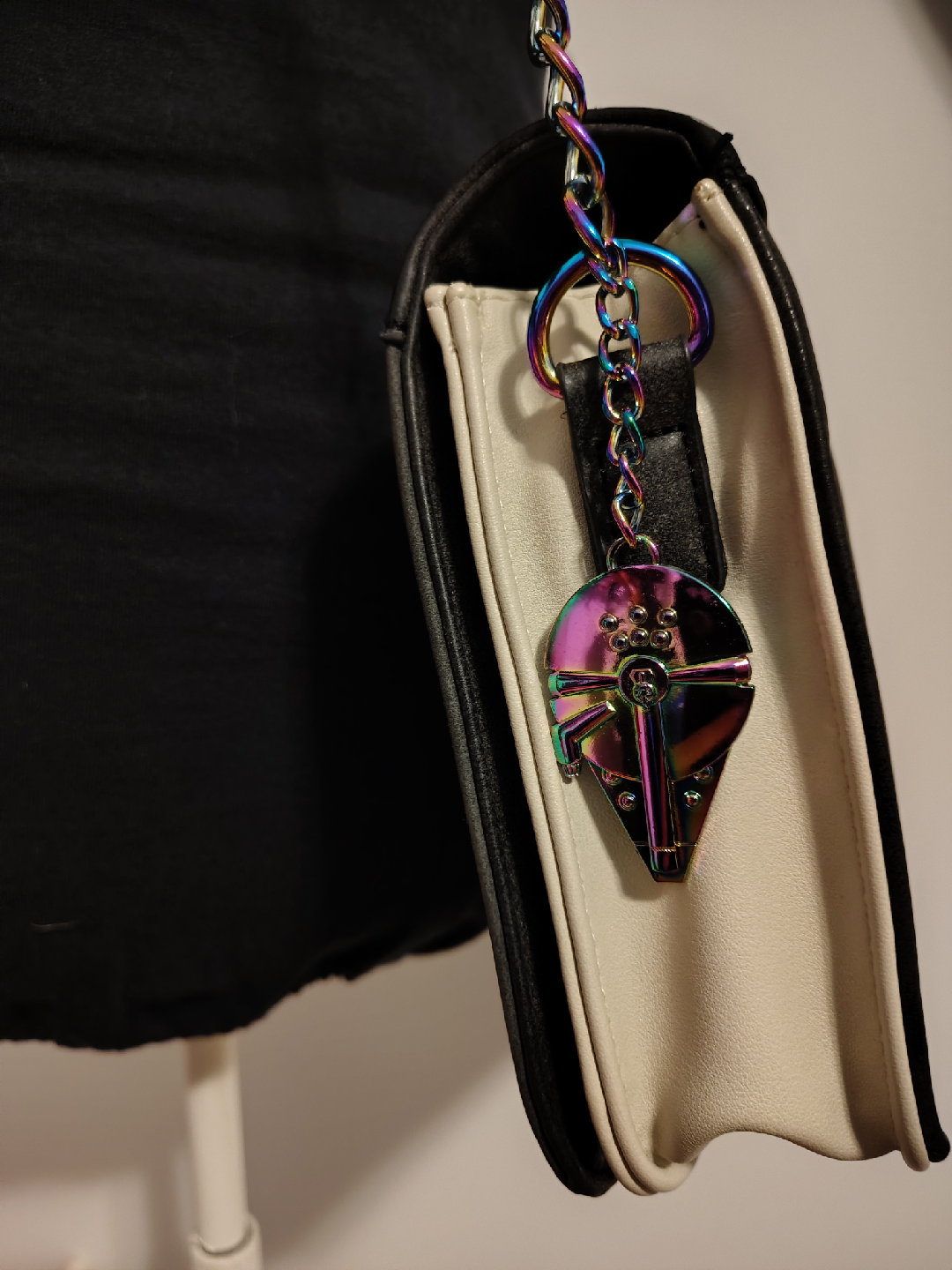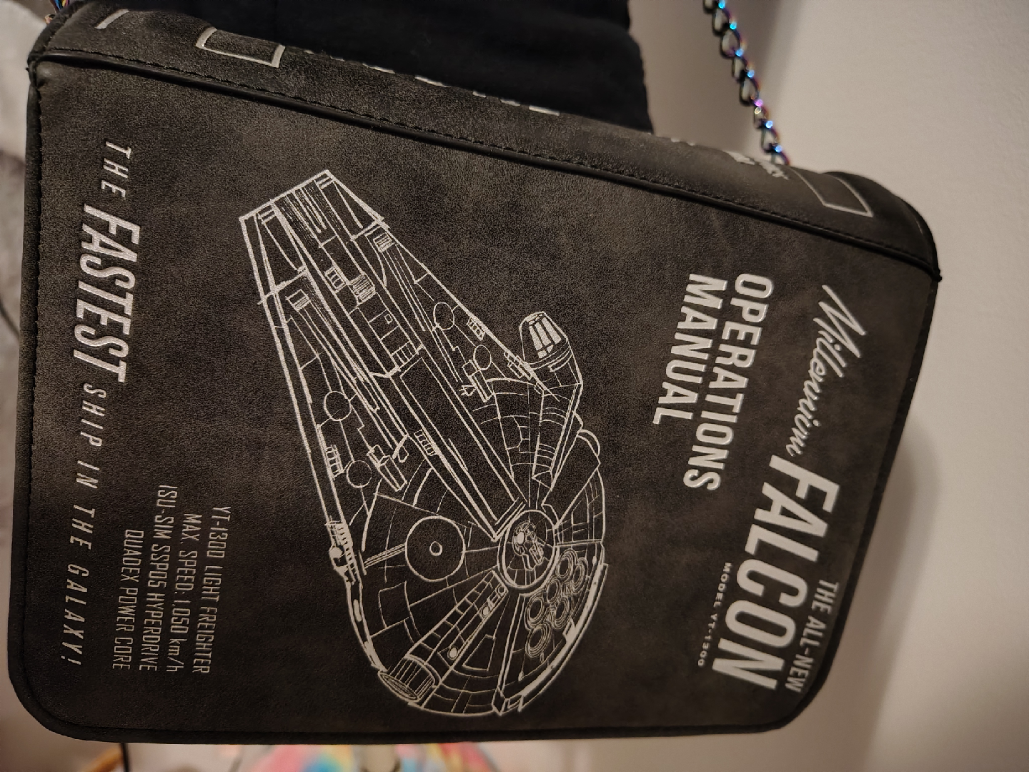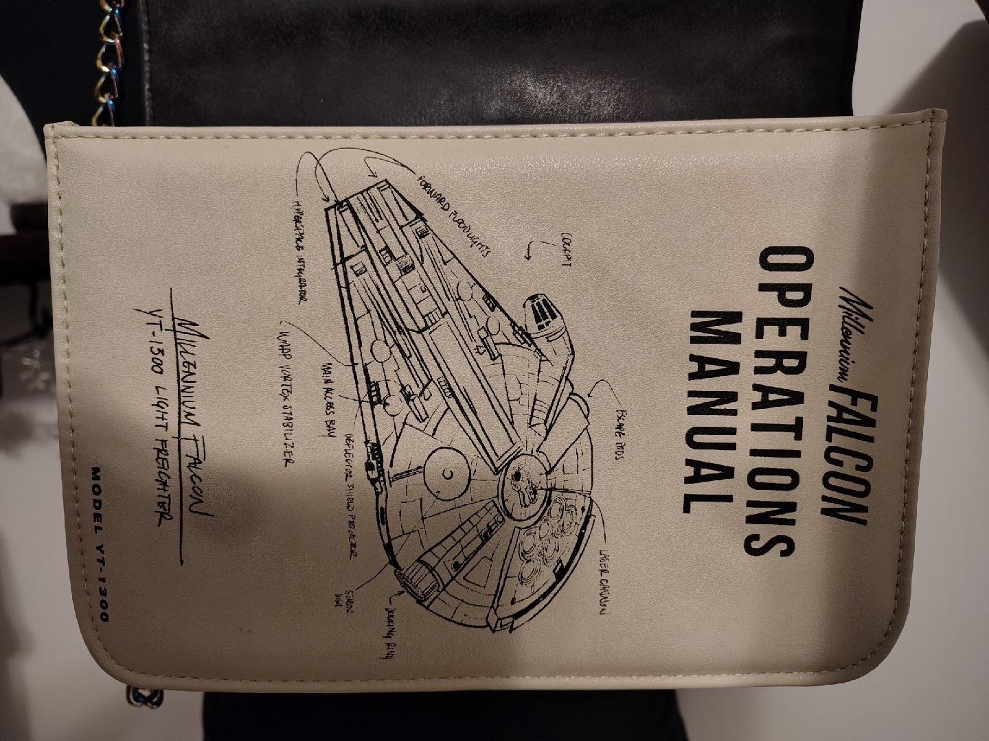 This is a Star Wars Millennium Falcon Operations Manual crossbody bag! It features a cool design of the Millennium Falcon and the Star Wars logo. Perfect for any Star Wars fan!
