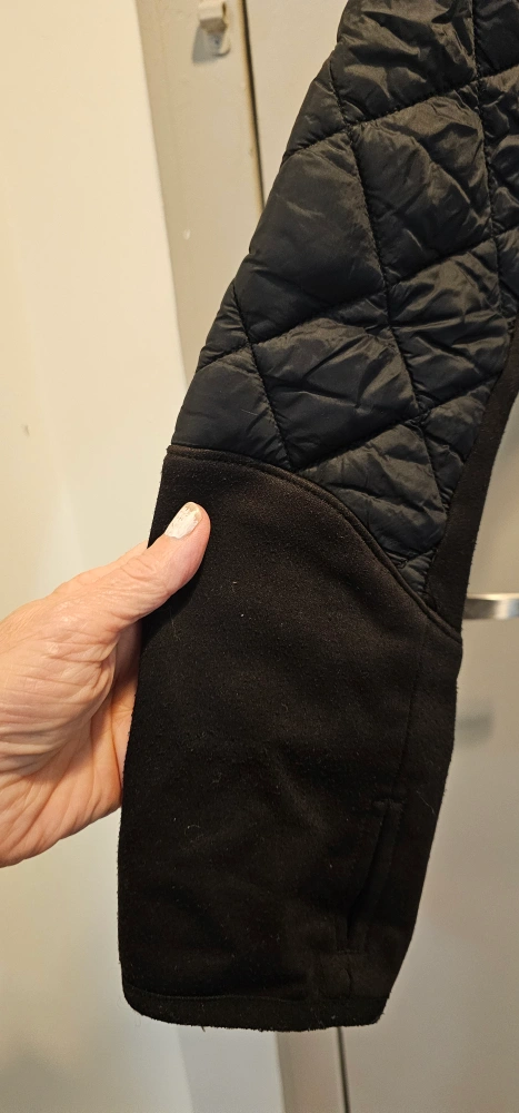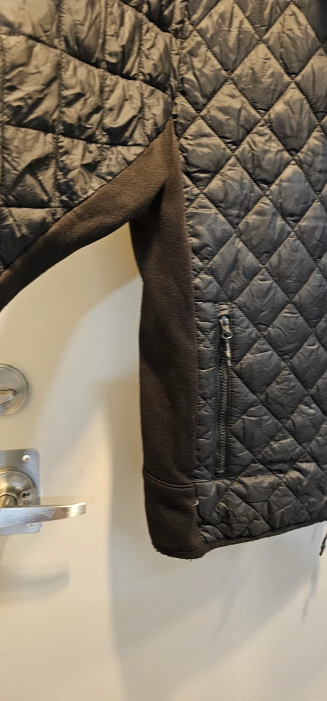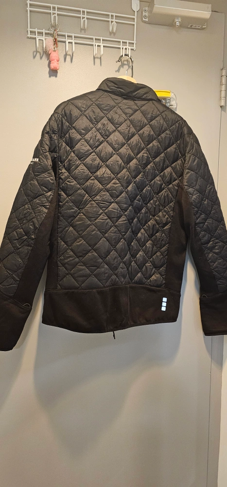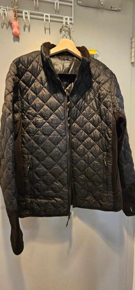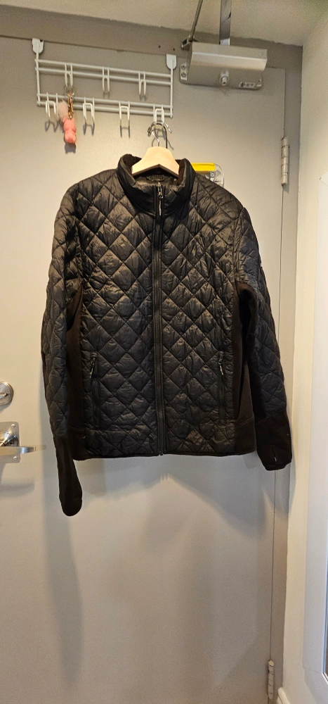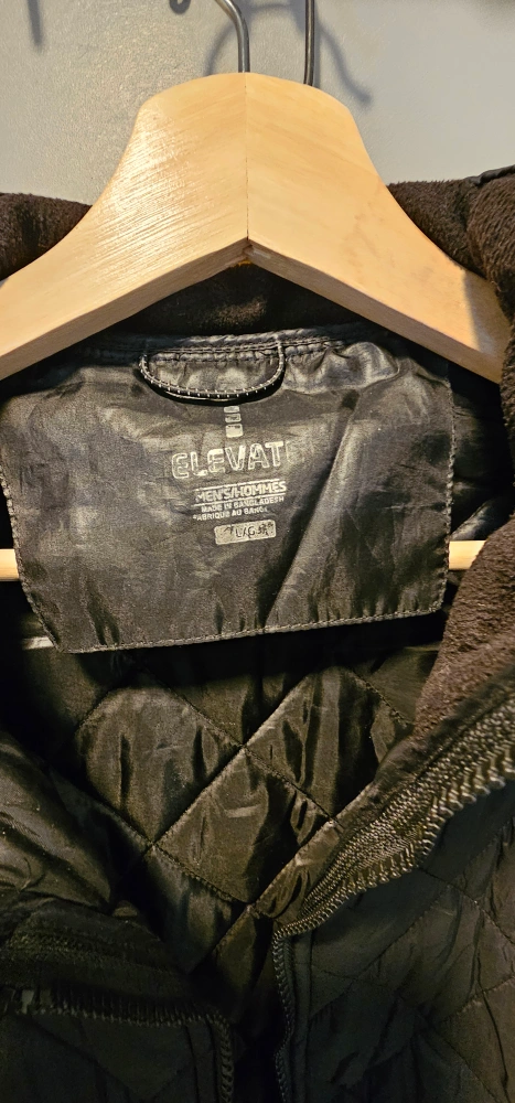 Selling a men's black quilted jacket from Elevate in size L. It's in great condition and ready for a new home! The jacket features a stylish quilted pattern and is perfect for layering during cooler weather. It also has some fleece-like material on the sides and sleeves.