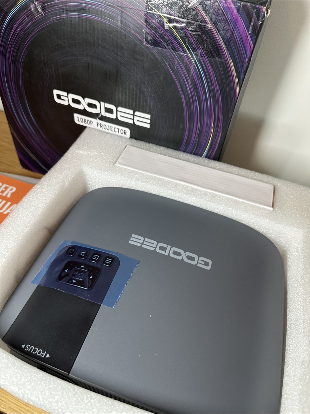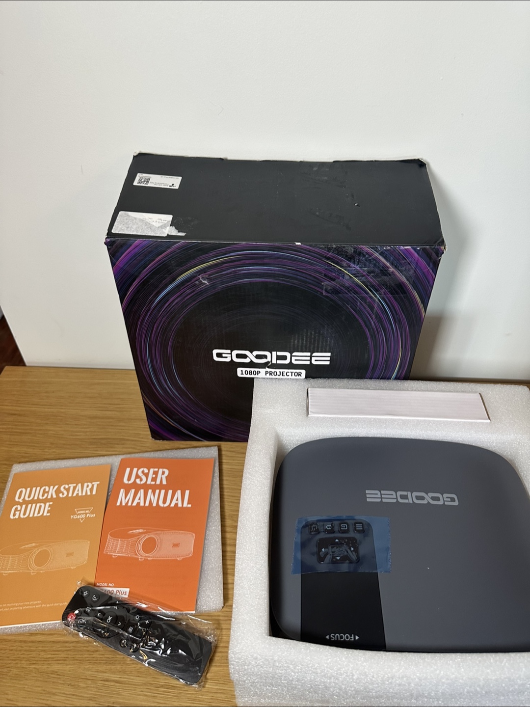 Selling a GOODEE projector. It comes with its original box, a quick start guide, a user manual, and a remote control. Great for movie nights or presentations!